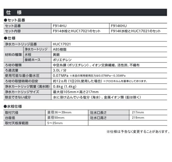 よく一緒に購入されている商品富士工業/FUJIOH レンジフード MP-M7,979円 こちらの店舗では沖縄・離島への配送を承ることができません。 ■「グローエ社」がクリンスイのために開発した水栓デザイン 【各メーカーお問い合わせ先一覧】 製品に関するお問い合わせはこちらからお願い致します。 2021年11月時点のメーカー情報・カタログ情報に準拠しております。 ※型番を事前にご確認の上、お問い合わせいただきますよう宜しくお願い申し上げます。 ※写真はイメージです ※メーカー都合により外観・仕様は予告なく変更されることがあります。 ご購入前にメーカーサイト等でご確認をお願い致します。 カテゴリ:浄水器 ビルトイン浄水器 アンダーシンク型 アンダーシンク グローエ メーカー:三菱ケミカル・クリンスイ Cleansui 型番:F914HU / HUC17021 付属浄水カートリッジ:HUC17021除去物質数:17+2 類似商品はこちら『在庫あり』 三菱ケミカル・クリンスイ F9169,700円三菱ケミカル・クリンスイ F915HU アンダ97,973円三菱ケミカル・クリンスイ F914KEHU ア105,468円三菱ケミカル・クリンスイ F914KHU アン102,751円三菱ケミカル・クリンスイ F915KEHU 105,396円三菱ケミカル・クリンスイ F915EHU アン102,568円三菱ケミカル・クリンスイ F915KHU 102,568円三菱ケミカル・クリンスイ F904HU アンダ78,980円 三菱ケミカル・クリンスイ F924EHU ア81,641円新着商品はこちら2025/12/2ダイキン S226ATKS-W エアコン 6畳133,415円2025/12/2ダイキン S256ATKS-W エアコン 8畳144,965円2025/12/2ダイキン S286ATKP-W エアコン 10156,515円再販商品はこちら2025/12/3XND1505BYKDD9 ダウンライト 埋込19,865円2025/12/3『在庫あり』 パナソニック NP-45MD9W122,403円2025/12/3『在庫あり』 パナソニック NP-45VS9S95,453円2025/12/03 更新