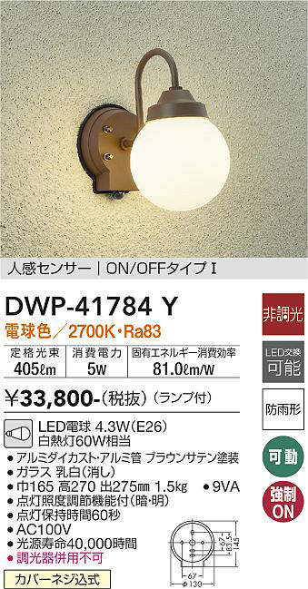 大光電機(DAIKO) DWP-41784Y アウトドアライト ポーチ灯 非調光 電球色 LED ランプ付 人感センサー ON/OFFタイプl 防雨形 ブラウン