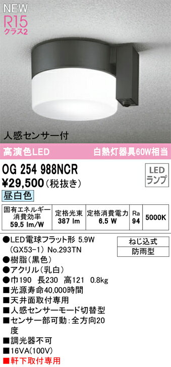 オーデリック OG254988NCR(ランプ別梱) エクステリア ポーチライト LEDランプ 昼白色 高演色LED 人感センサー付 防雨型 黒色