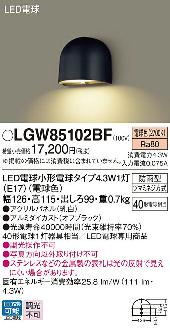 パナソニック LGW85102BF 表札灯 LED(電球色) 壁直付型 LED電球交換型 パネル付型 防雨型 オフブラック