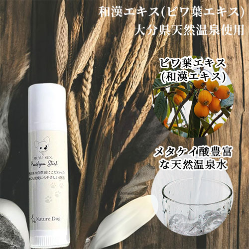 天然由来の自然派にこだわった保湿バーム ■ Nature.Dog.プニきゅうスティック 『化粧品メーカーが作った自然なやさしい原料でつくった安全・安心なプニきゅうスティック』には自然豊かに育った実がなる前の栄養豊富な国産ビワ葉を使用したビワ葉エキス(和漢エキス)と国内有数の温泉県大分県の温泉水を使用しました。さらにオーガニック認証のオイルを配合。皮膚トラブルのお悩みの多いワンコのケア・予防に。 【パラベン・鉱物油・界面活性剤・着色料・香料・シリコン・防腐剤】フリー お散歩帰り・お風呂後、日頃乾燥するところ又は気になる箇所(肉球・耳・お腹・しっぽ等)にやさしく塗り込んでください。 ■ Nature.Dogシリーズとは Nature.Dogシリーズは、自然な原料にこだわったワンコにやさしいドッグケアシリーズです。 厳選した「和漢エキス(ビワ葉エキス)」と「天然温泉水」を配合した安心・安全な製品となっております。 ■ 原材料へのこだわり びわの葉・・・温暖な気候と豊かな自然環境で育った九州産のびわ葉を主に使用しています。九州は、江戸時代からびわ栽培の歴史があり、伝統的な栽培技術と現代の技術が融合された、高品質なびわ栽培の地域として知られています。また果実(びわ)がなる前の栄養をしっかり蓄えた時期に、成熟した古葉のみを採取しています。 温泉水・・・当社敷地内の地下800mから湧出している温泉水は、「メタケイ酸」が豊富に含まれています。この「メタケイ酸」は、『美人の湯』や『美肌の湯』として広く知られ、天然の美容成分として多くの方に親しまれています。 メタケイ酸:95.2mg(温泉成分分析表より) 商品名 MUYU-SEN Nature.Dog.プニきゅうスティック 名称 保湿クリーム 内容量 5g 商品コード 無香:J4595643174110 精油:J4595643174097 成分 無香料:ミツロウ、ホホバオイル、ビタミンEオイル、温泉水、和漢エキス(ビワ葉エキス) 精油:ミツロウ、ホホバオイル、ビタミンEオイル、温泉水、和漢エキス(ビワ葉エキス)、ラベンダー油 使用方法 適量を出して気になる箇所を清潔にした後やさしく塗り込んでください。 使用期限 製造から3年 保管上の注意 □ 極端に低温または高温の場所や直射日光の当たる場所をさけて涼しい場所で保管してください。(溶けた場合は冷蔵庫に入れると固まり、再度ご使用頂けます) □ 小さなお子様やペットの届かない安全なところに保管してください。 ※開封後はなるべくお早めに使い切ってください。 ご注意 □ 異常が生じていないかよく注意して使用してください。 □ 異常があらわれた場合は使用を中止し、獣医師にご相談ください。 製造者 有限会社くす無憂扇 大分県玖珠郡九重町大字野上2861-109 区分 日本製・ペット用品 広告分析 コスメボックス 097-543-1871配送について ■ 5セット以上ご注文の場合は複数便扱いになる場合がございます。 ■ 宅配便発送の商品と同時にご注文をされた場合(かつ商品代金が3,980円未満の場合)は別途送料800円が加算されます。 ■ 弊店からの受付メール送信後のご注文内容の変更およびキャンセルはお受け出来ません。 ※変更のご希望がございます場合は必ずご注文後すぐにご連絡ください。 メール便注意事項 ■ メール便はポスト投函&簡易包装です。 ■ 日時指定は出来ません。 ■ 配送時の紛失・破損・遅延・盗難等不着トラブルが発生した場合、補償は一切ございません。 ■ ポストに入らない場合は持ち帰りとなり、不在票が投函される場合がございます。 ■ 外箱のつぶれ、へこみ等を理由にした返品・交換は対応できかねますのでご了承ください。