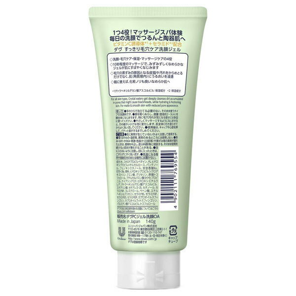 ●ダヴ すっきり毛穴ケア洗顔ジェル。目立つ毛穴をうるおいケアでなめらか陶器肌へ。●全肌用のダヴのジェル洗顔。ジェルが毛穴汚れをしっかり浮かせて落とし、きれいになった毛穴にうるおいを届けます。●保湿成分しっかり配合。ビタミンC誘導体*1、そしてセラミド*2を配合。毛穴の奥の皮脂・汚れを除去し、しっかり保湿します。●この洗顔1つで洗顔・毛穴目立ちケア・保湿・マッサージケアの4役ができる!洗うだけで、よりうるおったやわらか肌に。朝洗顔にもおすすめ*1 テトラヘキシルデカン酸アスコルビル:保湿成分 *2 保湿成分<本体>【使い方】●手のひらで泡立てる必要のない、そのまま使うタイプの洗顔料です。●顔を軽くぬらし、適量(直径約2〜3cm)を顔全体になじませます。特に毛穴汚れが気になる部分には多目に使ってください。●やさしくマッサージするようになじませると、きめ細かい小さな泡に変化します。肌全体に行き渡らせてからよく洗い流してください。●使用後は、キャップ中心部を押して、パチッと音がするまでしめてください。【成分】水、コカミドプロピルベタイン、PG、ヒドロキシプロピルメチルセルロース、パンテノール、フェノキシエタノール、安息香酸Na、EDTA-2Na、香料、ヒドロキシプロピルシクロデキストリン、クエン酸、グリセリン、酢酸トコフェロール、ブチルカルバミン酸ヨウ化プロピニル、ナイアシンアミド、ヒドロキシエチルウレア、テトラヘキシルデカン酸アスコルビル、ステアリン酸、セテアレス-25、セタノール、セラミドNP、コレステロール、ベヘン酸、エチルヘキシルグリセリン、セラミドNS、セラミドAP、セラミドEOS、セラミドEOP、カプロオイルスフィンゴシン、カプロオイルフィトスフィンゴシン、パルミチン酸アスコルビル、トコフェロール【メーカー・販売業者】@cosme SHOPPING (商品に関するお問い合わせ)【広告文責】株式会社アイスタイルリテール 03-6832-7670ダヴ