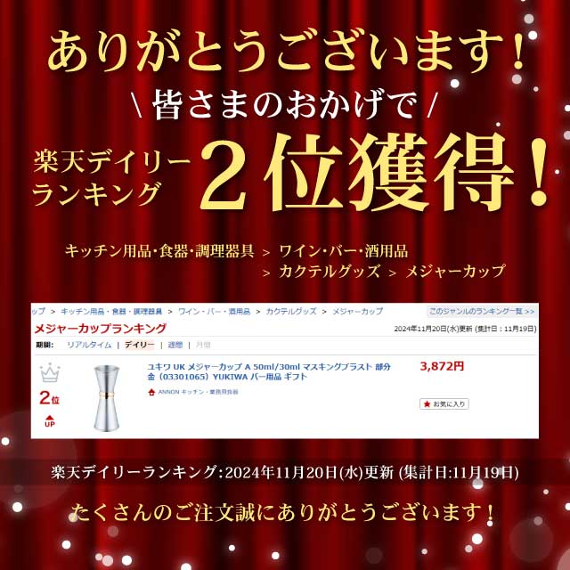 【包装のご案内】ユキワ UK メジャーカップA 50/30ml [部分金マスキングブラスト] (MBG-UK-JIGGER-A)ステンレス製カクテル用メジャーカップカクテル作りには欠かせないアイテム。サイズは3種類があるのが魅力的。Bサイズがもっともよく使われている標準サイズですが、複数のサイズを組み合わせて使うバーテンダーの方もいらっしゃいます。 商品詳細 メーカー YUKIWA アイテム メジャーカップ サイズ 高さ11.3cm 50ml/30ml備考 ▼家庭用食器洗い乾燥機、業務用食器洗い乾燥機がご使用いただけます。 2025 ギフト gift プレゼントに最適 プチギフト 贈り物 ギフトセット お祝い お土産 お礼 お返し お配り 記念品 景品 粗品 ノベルティ 誕生日謝恩会 生活雑貨 御年賀 お年賀 バレンタイン ホワイトデー 卒園 卒業 退職 入園 入学 就職 母の日 父の日 敬老の日 クリスマス 実用的 おしゃれ オシャレ お洒落 キレイ 綺麗 かわいい 可愛い おすすめ 彼氏 彼女 妻 夫 奥さん 旦那 嫁 男性 女性 両親 祖父母 おじいちゃん おばあちゃん お父さん お母さん 自分用 家族 自分用 家族ユキワ UK メジャーカップA 50/30ml [部分金マスキングブラスト] (MBG-UK-JIGGER-A)★ギフト対応★