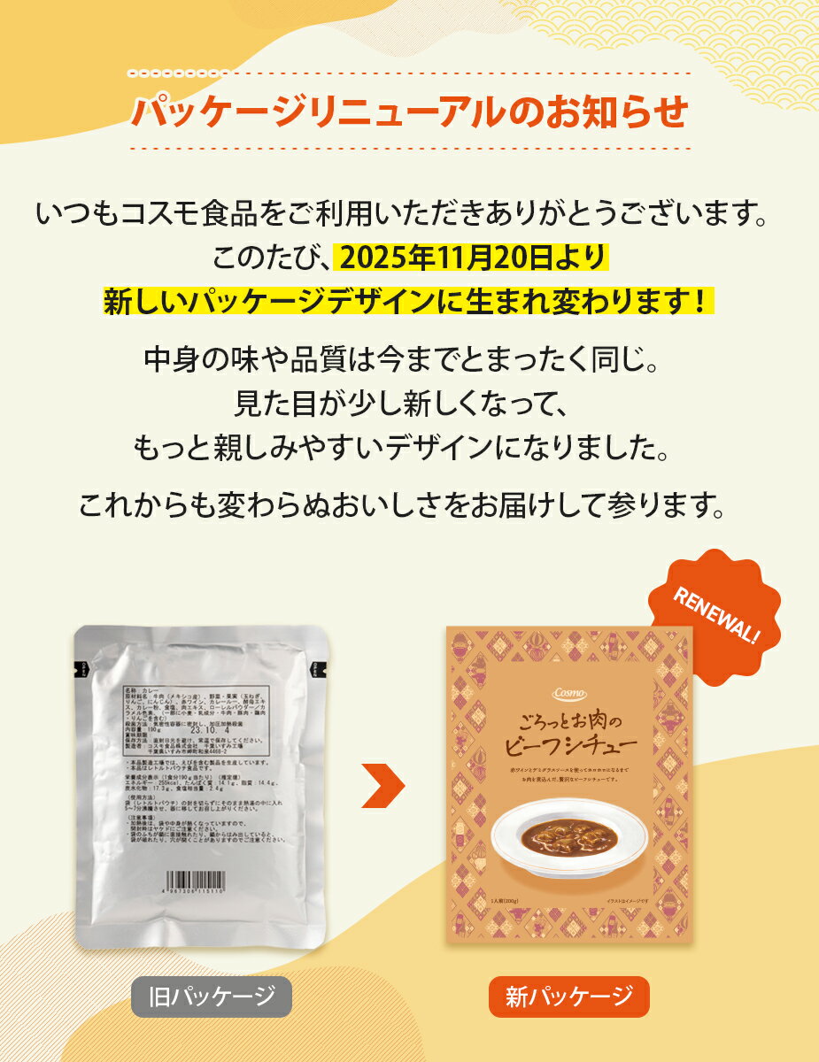 商品情報名称ビーフシチュー原材料名牛肉(メキシコ産)、赤ワイン、シチュールウ、デミグラスソース、ソテーオニオン、りんごピューレ、トマトペースト、ビーフエキス、バター、酵母エキス、砂糖、肉エキス、おろしにんにく、香辛料/カラメル色素、(一部に小麦・乳成分・牛肉・大豆・鶏肉・豚肉・りんごを含む)内容量200g×10賞味期限別途商品ラベルに記載保存方法直射日光を避け、常温で保存してください。製造者または販売者コスモ食品株式会社東京都大田区大森北2-4-18大森ビル7F製造所固有記号は賞味期限右に記載備考モニターの発色具合によって実際の商品と色が異なる場合がございます。ビーフシチュー10個セット 送料無料 レトルト フードロス削減 訳あり商品 防災 お手軽 時短 保存食 常温保存 長期保存 ストック食材 レトルト食品 赤ワインとデミグラスソースでお肉を贅沢に煮込みました。本格的な味わいをお楽しみください。 5 \おすすめ商品/
