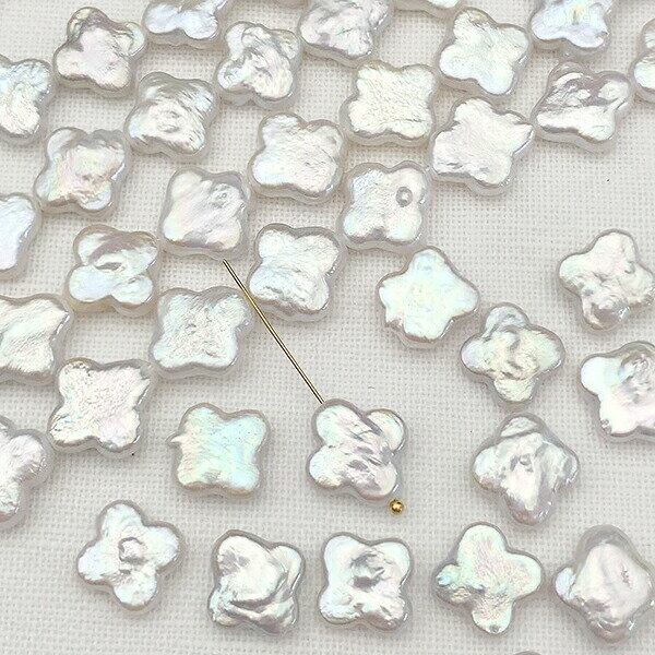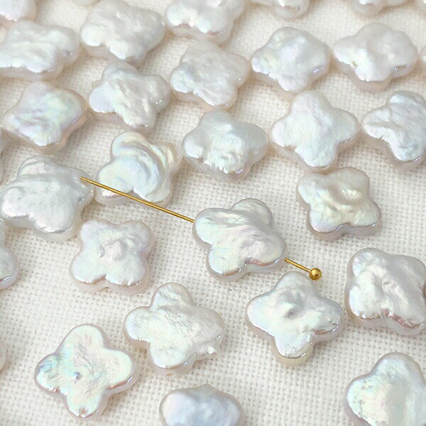 四葉のクローバーのように愛らしい、可憐なフラワー形の淡水パール。 ころんと咲いたお花を一粒添えるだけで、アクセサリーに優しさと幸せをもたらしてくれます。 淡水パール特有のうねりや小さな凹凸がありながらも、上品な光沢と、角度によってふんわりと光がゆらめく艶めきが魅力です。 小ぶりでも存在感のあるシルエットで、ピアスやブレスレット、チャームなど幅広くお楽しみいただけます。 人気のモチーフですので、気になる方はぜひお早めに。 なお、連の中には少し形が崩れているものも含まれますが、それぞれの個性としてお楽しみいただければ幸いです。 不良ではありませんので、あらかじめご了承ください。【天然石 ビーズ 淡水パール パーツ】テグスやワイヤーを穴に通して使います