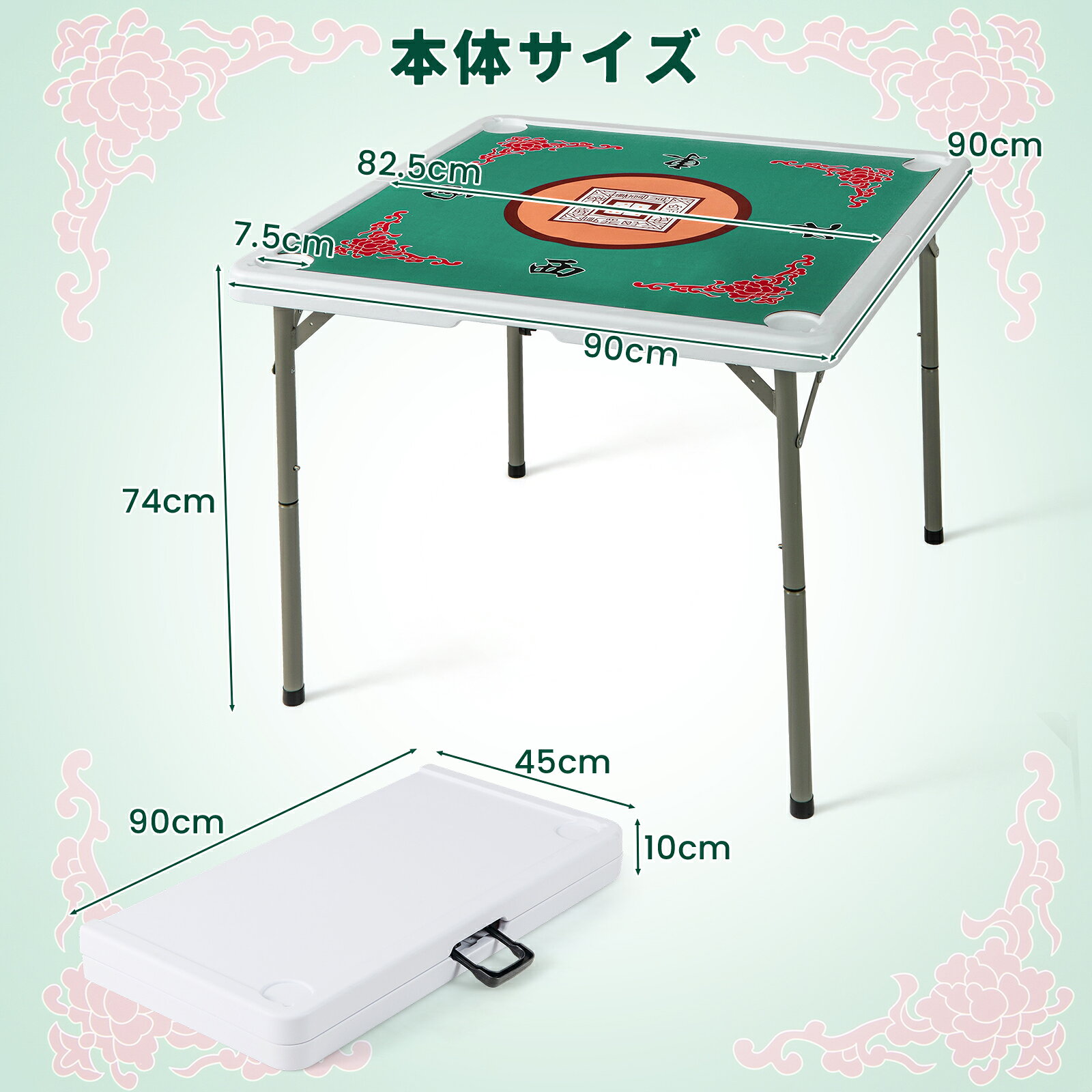 ★本体サイズ:約幅90cmx奥行90cmx高さ74cm/★折りたたみサイズ:90cmx奥行45cmx高さ10cm/★耐荷重:50kg/★本体重量:11kg【2段階高さ調節可能】この麻雀卓は、2段階の高さ調節が可能。座ったままでのプレイが快適にできる高さに調整できるため、どんな場所でも最適なプレイ環境を提供します。畳の上でもテーブルが安定し、腰を痛めることなく長時間楽しむことができます。【コンパクト収納&軽量で持ち運びラクラク】使わない時には簡単に折りたたんで収納でき、限られたスペースでもストレスなく保管可能です。特に狭い部屋でも、折りたたんだ後のサイズは非常にコンパクトで、収納棚にスッキリ収まります。軽量設計で持ち運びが非常に簡単。持ち運びがラクなので、家でも外出先でも気軽に麻雀を楽しめ、友人や家族との集まりにもぴったりです。【高品質で長持ちする耐久性】使用している素材は、耐久性が高く、長期間使用してもへこみや傷が付きにくい丈夫な作り。ゲーム中の激しい動きにも安心して対応できる安定感があります。さらに、卓面は滑り止め加工が施されており、牌がズレることなくスムーズにプレイできます。何時間プレイしても、安定したプレイ環境が守られます。【家族や友達との楽しい時間をサポート】この卓は麻雀以外にもトランプやボードゲーム、カードゲームなど、さまざまなゲームにも最適。家族や友達と囲んで、笑い合いながらゲームを楽しむことができ、素晴らしい思い出作りをサポートします。自宅でのリラックスした時間をさらに充実させてくれること間違いなし。【ご購入前のご確認】当商品は、マットの東西南北の印刷位置にご注意いただく必要があります。購入前に、印刷位置がご希望に合っているかご確認の上、ご購入をお願いいたします。
