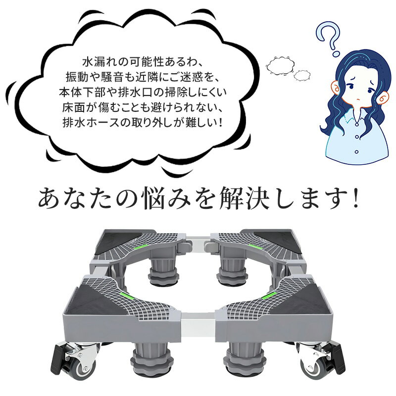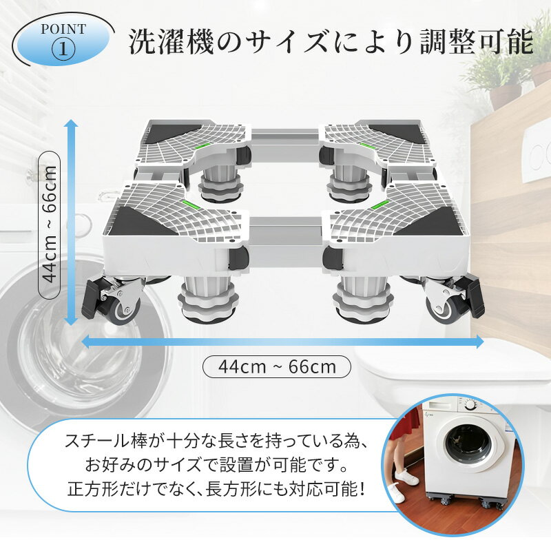 【汎用性が高く、様々な家電に対応】 さまざまなサイズの洗濯機や冷蔵庫にお使い頂けます。 こちら「洗濯機置き台」は、土台に円型スライドバーを採用し、 縦横のサイズ(45~68cm)を簡単に調整が可能です。 ※【注意】最大有効幅は64cm×61cmでございます。 サイズの大きいドラム式洗濯機や全自動式洗濯機にもお使い頂けます。 360度回転するキャスターを採用し、女性でも簡単に動かすことができます。 また、洗濯機置き台という名前ですが、食洗器などの家電や大きめの家具などにもお使いいただけます。 【移動が簡単・お掃除・排水もスムーズ】 足元には大型ジャッキ8本とパイプが8つ付属。 ジャッキで高さを調節が可能です。 床と洗濯機の間に約10cmの隙間を作ることができるため、通気性が高まり、 湿気などにより引き起こされる錆び等の問題に頭を悩ませることもなくなります。 足元のキャスターは左右別々の動きが可能で、 排水管掃除などの移動の際も、スムーズに動かすことが可能です。 【耐荷重約500kgを実現した頑丈な作り】 高強度のステンレスとポリプロピレン樹脂を採用し頑丈で水回りでも錆びにくく、 安定性にも優れております。最大で約500kgの重量に耐えられる設計になっています。 大型のドラム式洗濯機にも対応しており、ご家族が多いご家庭の洗濯機にも使用可能です。 洗濯機以外にも使用でき、引っ越しが多い方などは役立つこと間違いなし! 適合する大きさの家電製品から鉢植えなど幅広く使用でき、簡単に運べてしまうスグレモノです。 【安定感と防振対策】 足元にある大型ジャッキとキャスターストッパーにより、 乗せた家電をしっかり固定できます。洗濯中に揺れても動きません。 また、特殊ゴムを各キャスターとジャッキ底部に施し、防振・防音効果をアップさせました。 マンションなど階下への振動音が心配な方にもおすすめです。 【8ヶ所に水平器付き・組立が簡単】 設置する際に土台の高さにばらつきがあれば、 バランスが取れず最悪の場合には倒れてしまうこともあります。 また、洗濯機が作動している時の音がうるさくなります。 しかし、本製品は8ヶ所に水平器が付属しているため、設置の際、確認することができます。 斜めになったりバランスが悪くこともありません。 組み立ては約2分ほど。工具も不要なため女性にも安心です。