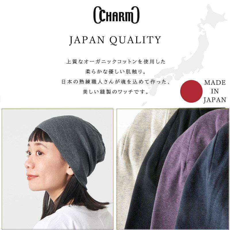 サイズSサイズ 【平置き状態でかぶり口:23cm 高さ22cm】 Mサイズ 【平置き状態でかぶり口:24cm 高さ23cm】 Lサイズ 【平置き状態でかぶり口:25cm 高さ24cm】 *入荷時期により工場が異なりますので同じサイズでも袋・紙タグの仕様が若干異なりますのでご了承ください。 素材オーガニックコットン(綿)100% 生産国日本製 ブランドCHARM 商品詳細 肌に直接触れるものだから、素材、デザイン、仕上がりまで こだわりを持って作った日本製のオーガニックコットン帽子。 柔らかく伸びの有る天竺ガーゼ素材を使用し、女性の方はもちろん、 男性でも締め付け感が無く、ノンストレスでかぶれるサイズ感。 生地は二枚仕立てで透けずに暖かく、春夏秋冬、一年中季節問わずかぶれます。 また肌あたりも気持ちよく外出帽子としてはもちろん、 室内帽子、就寝用帽子など、長時間着用時でも安心です。 綿帽子なので、発汗吸収性、保湿性も抜群。洗濯も可能です。 オーガニックコットンを使用しているので、お肌の弱い方や抗がん剤の副作用により、 刺激に敏感になる頭皮や頭部手術後の保護キャップとして、医療用帽子にも最適なアイテム。 人気アイテムのなので、ギフトにも間違いの無いおすすめ帽子です。 UVカット 最大遮蔽率 99.9%・紫外線防止指数 UPF50+(検査済) 日差しをしっかりと遮断し、紫外線から大切なあなたのお肌を守ります。 もともと、布地にはかなりの量の紫外線カットの性質が備わっています。 その為、特殊な加工をしなくても、UVカット機能があります。 *UPFとは…紫外線対策の先進国であるオーストラリアやニュージーランドで用いられているUVカットの世界的基準値のことを示します。UPFは数値で表示され、UPF50+が最高値です。 ※認証機関より認証されたオーガニックコットンを使用しております。 ※生地の入荷時期により色の濃さ等が異なります。 注意点 ・長時間濡れたままで重ねて置いたり、汗や雨などでぬれた時は他の衣料等に移染する場合がございますのでお気を付け下さい。 ・多少実際のカラーと異なる場合がございます。ご不安な事などございましたらお気軽にお問い合わせ下さい。 関連商品 メンズアイテム一覧はこちら レディースアイテム一覧はこちら カラー 【カラー バリエーション】 ・ダークグレー 灰色 DARK GRAY ・ブラック 黒色 BLACK ・クリーム 白色 CREAM ・ライトグレー ねずみ色 LIGHT GRAY ・ブラウン 茶色 BROWN ・パープル 紫色 PURPLE ・ネイビー 紺色 NAVY 仕様・機能 帽子、ぼうし、ニット、ニット帽、ニット帽子、ニットキャップ、ワッチ、ワッチキャップ、ビーニー、ビーニーキャップ、キャップ、防寒帽子、医療用、医療、医療帽子、医療用帽子、医療用キャップ、抗癌剤、抗がん剤治療帽子、ケア帽子、頭、手術、お見舞い、病院、患者、薄毛隠し、白髪隠し、脱毛、円形脱毛症、保護、ナイトキャップ、就寝用帽子、室内帽子、室内用帽子、室内キャップ、肌に優しい、メンズ、男性、男性用、父親、お父さん、紳士、祖父、おじいちゃん、スキンヘッド、坊主、レディース、ミセス、女子、女性、女性用、婦人、ママ、祖母、母、母親、お母さん、おばあちゃん、婦人帽子、ユニセックス、大人、お年寄り、高齢者、シニア、10代、20代、30代、40代、50代、60代、70代、80代、90代、春、春用、春物、夏、サマー、夏用、春夏、春夏物、春夏用、春用帽子、夏用帽子、春夏帽子、春帽子、夏帽子、春の帽子、夏の帽子、秋、秋用、秋物、冬、冬用、冬物、秋冬、秋冬物、秋冬用、秋用帽子、冬用帽子、秋冬帽子、秋帽子、冬帽子、秋の帽子、冬の帽子、オールシーズン、あったか、あったかい、あたたかい、温かい、暖かい、冷え予防、冷え対策、シンプル、おしゃれ、お洒落、可愛い、かわいい、透けない、無地、綿100%、コットン100%、オーガニックコットンワッチ、オーガニックコットン帽子、オーガニックコットンキャップ、コットンファミリー、cotton family、通販 用途 ギフト、プレゼント、誕生日プレゼント、クリスマスプレゼント、バレンタイン、ホワイトデー、母の日、父の日、敬老の日、外出用、室内、室内用、家、屋内、アウトドア、自転車、防寒、寒さ対策、ブランド、人気、ファッション ■レディースワッチランキング レディースワッチ一覧はこちら >