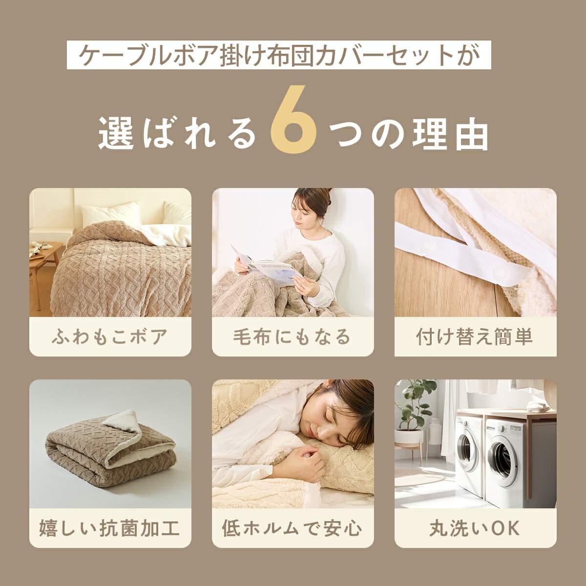 メーカー希望小売価格はメーカーサイトに基づいて掲載しています\ 人気のあったか寝具はこちら / [ ふわもこ ] ケーブルボア 布団カバーセット S (3点セット) / D (4点セット) 寒い冬でも布団に入った時にひやっとしない、 全身をふわもこで包む、やさしい暖かさが続く布団カバーセット。 【ふわもこな見た目にキュン!】 今年の冬のイチオシ、「ケーブルボア」を 大胆にあしらった布団カバーセットが新登場! いつもの寝室に置くだけで、とびっきりの空間に。 【極上の「ボア」を揃えました】 掛け布団カバーの表面は立体感のあるケーブルボア、 裏面はもこもこと羊のような肌触りのシープボア。 敷きパッドと枕カバーも癒される肌触りのシープボアで、 全身が暖かさに包まれます。 【掛け布団カバーは毛布にもなる2WAY仕様】 すこし肌寒い春・秋は毛布として、 冷え込む冬は掛け布団を入れれば暖かさアップ! ロングシーズン活躍する、お気に入りの一枚に。 【衛生的でうれしい 抗菌加工】 生地には菌の繁殖を抑える抗菌加工を 施しており、第三者機関にて 実施した抗菌性試験にもクリアしています。 【あんしんの保証、 低ホルムアルデヒド】 乳幼児用品向けの有害物質試験法にて ホルムアルデヒドの試験をクリア。 安心して使える安全性が保証されています。 【洗濯機で丸洗いOK】 ご家庭の洗濯機での丸洗いOK! 汗をかいてもこまめに洗えて いつでも清潔に。 【カラーは選べる3色】 トレンドのくすみカラーがおしゃれな、 ミルキーホワイト / カフェモカ / シフォンベージュの3色をご用意しました。 [ セット内容とサイズ ] シングル (3点セット) ・掛け布団カバー:150×210cm ・敷きパッド:100×200cm ・枕カバー(1枚):43×63cm ダブル (4点セット) ・掛け布団カバー:190×210cm ・敷きパッド:140×200cm ・枕カバー(2枚):43×63cm ※敷きパッドは全てのセットで「ミルキーホワイト」色となります。 [ 材質 ] ポリエステル100% [ 生産国 ] 中国 [ お手入れについて ] ●色落ち・色移りの可能性がありますので他のもの分けてお洗いください ●塩素系漂白剤のご使用はおやめください ●洗剤は無蛍光洗剤をご使用ください ●お洗濯の際は洗濯ネットをご使用ください ●乾燥機のご使用はおやめください [ カラー ] ミルキーホワイト / カフェモカ / シフォンベージュ [ 同素材のアイテム ] 掛け布団カバーは こちら 枕カバーは こちら 布団カバーセットは 現在表示中です ブランケットは こちら ひざかけは こちら ごろ寝カバーは こちら クッションカバーは こちら [ 梱包について ] 簡易梱包でのお届けとなります 商品を袋にお入れし、宅配ビニール袋または段ボールに入れての発送です 布団カバーセットならCOYOLI [ 追加送料について ] 3,980円以上ご購入いただいた場合につきましても、配送地域が離島となる場合は別途送料を頂いております。 別途必要となる送料はご注文確定後、当店よりお送りするメールにご了承をいただいてからの加算・商品発送となります。 追加送料について詳しくは こちら ※お使いのモニターや部屋の照明により実際の商品とは色味が異なる場合があります。ご了承ください。 ▼▼▼ 公式LINE 新規友だち500円クーポン配布中 ▼▼▼