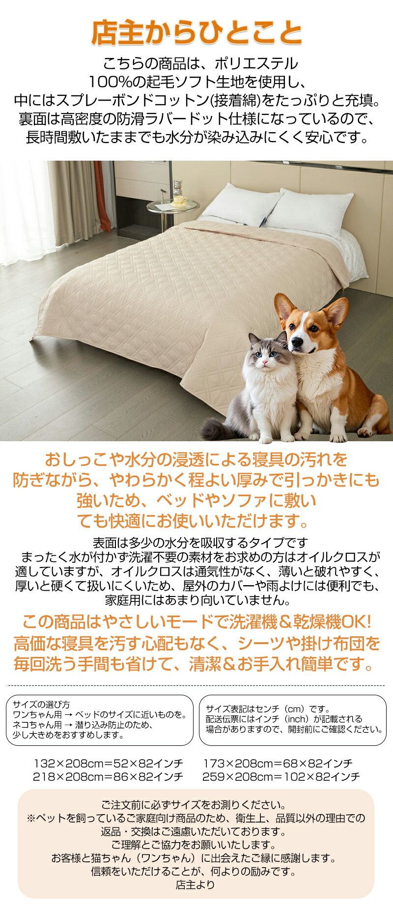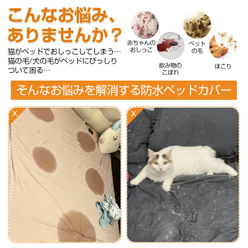 商品名: 防水ベッドカバー マルチカバー ペットマット ソファパッド かけるだけ 大判 防水ペットベッドマット 防水マット 防水カバー ベッドカバー 滑り止め ベッドスプレッド 洗える 犬用 猫用 介護用 プレゼント ペット 防水カバー 防水マット 犬 猫 うさぎ おしゃれ マット 防水シート ペットシーツ 滑り止め 大判 おしっこマット ペットマット ペット床材 床 傷防止 洗える シンプル ベッドカバー おしっこパッド 防水加工 洗える 速乾 防ダニ 汚れ防止 爪とぎ防止 プロテクター 滑り止め 犬猫 おねしょ 介護用 ベビー 高齢者 表地: 85g起毛防水布 中綿: 100gスプレーボンド綿 裏地: ポリエステル高精密起毛防滑布 製法: 超音波キルティングプレス加工 包装: PVC袋個別包装 【愛するベッドを守る、頑固な汚れともおさらば】 ペットの尿や嘔吐、よだれでベッドが汚れるのが悩みのタネ…。 この高性能TPU防水カバーなら、液体を瞬時にシャットアウトし、大切なマットレスをしっかり守ります。 掃除はとっても簡単、サッと一拭きで清潔に! 【1つで何役も!家中どこでも使える便利アイテム】 ダブルベッドやシングルベッドにぴったりの保護カバーはもちろん、 ソファや畳、ペット用ベッド、さらには車の後部座席にも使えます。 ペットがいるご家庭に必須の、お掃除ラクラクアイテムです。 【強力防滑設計でいつでも整ったベッド】 防滑点付きラバーバックデザインがベッドをしっかり固定。 活発なペットが動かしてしまう心配もなく、ベッドをいつでもきれいに保てます。 これで毎日のシーツの整理から解放!