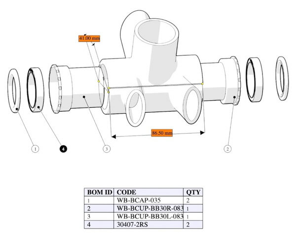 BB86規格フレームにRotorやEASTON 30mm クランク等を適合させる高精度ボトムブラケット。 重量増も承知の上で敢えてボディー本体にアルミではなくステンレスを採用したのは、BB86規格の狭い41mmの空間に30mmの軸を保持する剛性とベアリングの回転性能を維持させる為です。 軽量で摺動抵抗が少ないセラミックペアリングを採用。 嵌合タイプは左右ペアリングの歪みを少なくできカップの緩みや抜けを防止します。 クランク軸以外にもう1つの連結部が出来るのでBB周りの剛性が上がるというメリットもあります。 適合フレーム規格:BB86 適合クランク:ROTOR 30mm、EASTON 30mm、FSA 386EVO スピンドル軸径30mm 対応フレーム例:GIANT, ANCHOR, BMC, SCOTT, ORBEA, CANYON, など 対応BBサイズ:41mm / 86.5mm ベアリング素材:VHT処理G5グレード高精度セラミック(ベアリング規格30407) 本体素材:SUS304ステンレスbr> カラー:シルバー 重量:192g