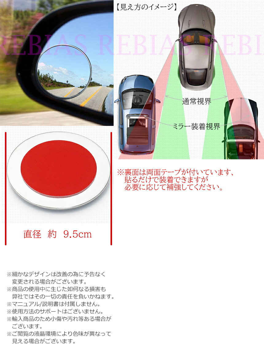 ■商品説明ビッグ補助ミラー サイドミラーからの視界にちょっと不満、、、 それならコレをお試しください!! 一番大きなサイズをご用意しました! 貼るだけ簡単装着! 今まで見えにくかった死角がよく見えるように♪ 安全運転には必須なアイテム!!※商品の使用中に生じた如何なる損害も弊社ではその一切の責任を負いかねます。※マニュアル/説明書は付属しません。取付/使用方法のサポートはございません。※輸入商品のため小傷や汚れ等ある場合がございます。※ご閲覧の液晶環境により色味が異なって見える場合がございます。※仕様(ロゴデザインやロゴの有無も含む)は変わる場合があります。(メール便での発送はポスト投函になります、 代金引換、日付指定はできませんのでご了承下さいませ) ■ 注意事項 ■< ご注文前に必ずお読みください > 海外製造品のため、軽微な傷や汚れ、バリ等ある場合がございます。 取扱説明書に関する説明が明記されていない場合、日本語取扱説明書は付属しておりません。説明書が無い、または他国言語の説明書が同梱されている場合がございます。 ご使用のモニターの兼ね合いで掲載画像と実際の商品とで若干、色合いの違いを感じる場合があります。 画像はイメージです。実際のサイズ感とは異なる場合がございます。 仕様・外観等は改善の為に予告なく変更する場合があります。商品在庫には万全を期しておりますが、システムの都合上、ご注文後に在庫切れの場合がございます。 万が一、在庫切れの場合は出荷予定日を改めてご連絡させていただきます。 商品の設置、仕様、使用などにより生じたいかなる損害、被害も弊社では一切の責任を負いかねます。ビッグ 補助ミラー サイドミラー 拡大 死角 サポート 事故防止 mirror