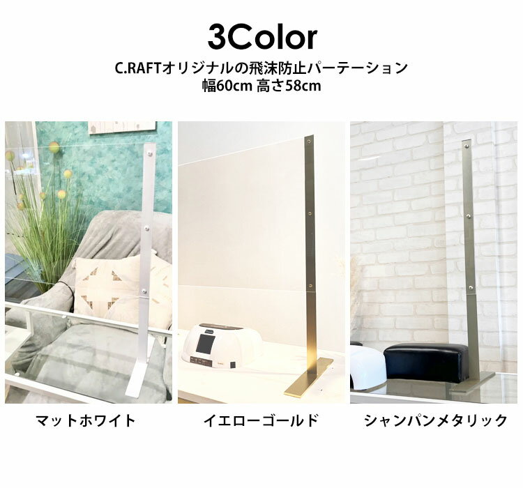 製品仕様 商品名 飛沫防止 スニーズガード サイズ/寸法 幅:60cm/開口部分54cm 高さ:ガード部分38cm/開口部分20cm カラー 柱&脚部分:マットホワイト、イエローゴールド、シャンパンメタリック塗装仕上 素材/材質 柱&脚部分:アイアン製 面板:クリアアクリル 付属品 透明アクリル板 × l T型アイアン脚 ×2 ナベ頭M4-10ボルト× 6 フランジナット× 6 ご注意事項 =ご使用上の注意= ・アクリル板はアルコールがつきますと白濁したり表面にヒビが入ることがありますのでご使用にならないでください。中性洗剤ですと大丈夫です。 ・アルコールは塗装面を傷めます。 ×アルコールの入ったウエットティッシュで拭く ×テーブルにアルコールスプレーをかけ拭き取らずその上に置くetc ※オーダーサイズも承ります。 ※送料無料 ※大量生産にも対応しています。 ※アクリル部分に店名や会社名・ロゴを入れる事も可能です。お気軽にご相談くださいませ。(別途1ヶ所1,500円〜) ※業販も可能ですので、お気軽にお問い合わせください。 モニターの発色の具合によって実際のものと色が異なる場合がございます。ご了承ください。 その他商品説明 C.RAFTオリジナルのスニーズガードです♪ アイアンとアクリルを融合させ、おしゃれかつあえてシンプルなデザインで製作しています。 柱と脚部分にアイアンを使用する事で 細く仕上げ、作業スペースをできるだけ広くし、ホコリやダストも溜まりにくい仕様にしています。 外観はあえてボルトナットで柱とアクリルを取付するようにし、デザイン的なアクセントとしました。幅60cm(開口54cm) 高さ58cm(開口20cm) 幅60cm(開口最大59cm) 高さ53.m(開口15cm) 9,680円 9,680円