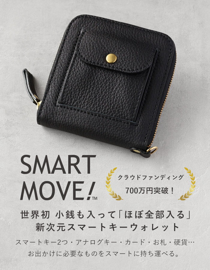 商品番号 MC1005 制作地 日本製 素材 【本体】シュリンク牛革 【ファスナー】YKK製 【付属品】made in Kyoto 化粧箱 サイズ 横:約10.5cm × 縦:約10.5cm 厚み:約2cm〜2.6cm(最大厚) 重量:約95g(自然素材のため個体差があります) カラー 路地入ル (ブラック) ■ おすすめポイント 『京都が世代を超え、受け継いできた「技」と「心」を、今の普通のくらしに活かしたい。』そんな想いを込めながら、京都にちなんだ作品を日々生み出している「洛景工房(らくけいこうぼう)」さん。 そんな洛景工房さんがプロデュースするのは、「あれこれ持ちたい、けれどスマートでありたい」そんな全ての大人に向けて作られた、その名も「SMART MOVE!」。 スマートキー2つ、紙幣、アナログキー、カードなど、お出かけに必要なものが「ほぼ全部」入る、これまでにない画期的なアイテムとなっています。 スマートキーを格納できる、スマートキーが使いやすい、空間の仕切りが多い、可能な限りコンパクトにする、品質を保ち、コストを抑える・・・これら5つのルールを軸に、スマートムーブが開発されました。 構想から約1年半、試行錯誤を繰り返しながら完成した「SMART MOVE!」。中央1箇所を縫製するだけで生まれるシンプルなX字ポケットが、驚きの収納力を実現。 収納する物の全てがベストポジションだから、ピッタリ・スッキリ収まり、内容物がしっかり形状を保持してくれます。特許取得済みの新構造で、クラウドファンディングで700万円達成の実績を誇ります! 「一度体験すると、もう元には戻れない」。カテゴリの枠を超えた必需品。出願からたった1年で特許取得できたことで、類似品が無いことが証明されています。 京都の美意識を追求した引き算の美学。ギリギリまで引き算し、シンプルな使いやすさと美しさを両立。 スマートキーを1つずつ、革で仕切られたポケットに収納できるので、スマートキー同士がぶつかって傷つくことはありません。その他のポケットには、カード類・紙幣などが収納可能。「マチ」によって程よく開くので、中身を取り出しやすいのも魅力です。 3本のアナログキーを平たく並ベて収納することで、厚みが抑えられています。鍵をすぐに取り出せるように、ファスナーの外側にポケットが作られているのもポイント。 穴の位置が低くても、革紐が長くても、スマートキーがこぼれ落ちてしまいます。ミリ単位で調整を重ねて、今の「高さ」と「長さ」に辿り着きました。 3本の指でスマートキーを持って人差し指を伸ばせば、丁度スナップボタンに引っ掛けることができ、ほんの1秒で取り外しができます。ディーラーで車を預ける時など、スマートキーだけを取り外したいシーンで役立ちます。鍵の付け替えも、面倒さを感じません。 電磁波が強いコインパーキングなど、スマートキーを取り出さないと反応しないような場所でも、ファスナーを少し開ければすぐに取り出してボタンを押すことができます。 必要なステッチはたったの1カ所のみ。縫製コストを極限まで抑え、使う革の量も減っています。「良いもの」だからこそ、多くの方に使っていただける価格を目指されています。 革はシュリンク牛革を使用。ふわふわの柔らかい手ざわりで、手にしっとり馴染みます。ファスナーはYKK製で開閉もスムーズに。職人歴30年の熟練技による組立て技術と美しい縫製が生み出す安心感と堅牢度。 伝統的な技法で一つ一つ丁寧に作られた貼り箱に入れてお届けします。こちらは、明治7年創業、京都・老舗の箱屋さんに別注されたもの。新生活や記念日などの、プレゼントにもオススメです。 財布・カードケース・鍵束の中から、ライフスタイルに合わせて「いつも持ち歩きたいもの」だけを選んで入れていただけます。 カード類、免許証や駐車券など車に乗る人が必要な券類、駐車代や自動販売機などで使用するお札も余裕で入ります。SMART MOVE!を使用することで、キャッシュレスに移行したり、持ち物を整理するきっかけになるかもしれません。 20代や30代の方はもちろん、40代・50代・60代の方でもオシャレご使用いただけます。メンズ・レディース(男性向け・女性向け)男女兼用で使って頂けます。 トヨタ(TOYOTA)のプリウス(プリウス50系・プリウス30系)や日産(NISSAN)のルークス、ダイハツ、スバル、スズキ、三菱などの各メーカーのスマートキーが収納可能です。 ご自分用としてはもちろん、お誕生日、記念日、クリスマス、バレンタイン、ホワイトデー、母の日、父の日、敬老の日などのギフト・プレゼントにもおすすめです。ラッピングをご希望の方は、ご注文時の備考欄(自由記入欄)にてお伝え下さいませ。洛景工房(らくけいこうぼう) SMART MOVE! Type2 スマートキーケース 小銭入れ付き SHRINK 路地入ル(ブラック) [MC1005] 『京都が世代を超え、受け継いできた「技」と「心」を、今の普通のくらしに活かしたい。』そんな想いを込めながら、京都にちなんだ作品を日々生み出している「洛景工房(らくけいこうぼう)」