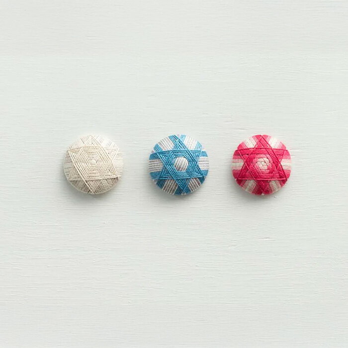 糸を巻いて浮かび上がる模様が愛らしい糸ボタン 4つのパターンで楽しむ12種類の表情!ディスクモールドのボタン thread wrapped button(スレッドラップボタン)といい、円盤状の型(モールド)を糸で巻きくるむことで模様を描きます。 6分割の基本的な巻き方で、単色の4パターン(基本)と基本をカラー&アレンジした計12種類の表情が楽しめます。 ブローチとしても、お手持ちのバッグにつけても、おしゃれでかわいいボタンです。 4種類の基本の巻き方は、動画で丁寧に解説していますので、動画を観ながら制作していただけます。 【ご用意いただくもの】 裁ちばさみ、糸切りばさみ、鉛筆、チャコペン、手縫い針、手縫い糸、手芸用接着剤、糸通し(スレイダー) ちくちくちどりオリジナル木製ボタン(芯)で作る ふっくらと丸みを帯びた木製ボタン(芯)は、ちくちくちどりさんの監修のもと、オリジナルを作りました。アーチ形の立体感のあるかわいいボタンは、裏側に少し凹みを作ったので、糸を巻いても裏側がフラットでブローチにしやすく、飾りボタンとしても使いやすくしています。 糸を渡す回数を変たり、斜め糸のかけ方を変えるだけで、異なる模様が浮かび上がり、作っているときも、作り終えたあとも楽しい糸ボタンをぜひ体験してみてください。 単色と色糸で楽しむ12種類の糸ボタン A〜Dの4種類の糸の巻き方を紹介しています。1色使いの基本から色糸を組み合わせたバリエーションまで合計12種類の表情が楽しめます。 1色(基本)の糸ボタンの4種類は、直径に糸を渡すスポークの回数や斜め糸のかけ方で浮かび上がる模様が変わり、とても不思議! さらに色糸を組み合わせると違った表情になります。 ディスクモールドのボタン 商品コード:CF9555 ディスクモールドのボタン4パターンが作れる材料と用具がセット ※ブローチ8個分のフェルトとブローチピンがセットされています。 デザイン:ちくちくちどり 完成サイズ:約 直径30mm (商品カテゴリ)手芸 キット 手芸キット 手作り 手づくり ハンドメイド 手芸用品 材料 インテリア かわいい 素敵 おしゃれ 趣味 プレゼント ギフト クラフト ものづくり モノづくり 手仕事 趣味 ホビー 母の日 大人向け handmade クラフトキット ボタン ディスクモールド 木製ボタン 可愛い