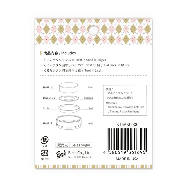 この商品は『クリックポスト』のご利用が可能です。 対象外の商品と一緒に、もしくは適用可能な個数を超えてご注文いただいた場合は、通常の配送プランでのお届けになります。あらかじめご了承ください。 詳しくはこちらの『お届けについて』をご覧ください。※クリックポスト(メール便)をご希望のお客様は、上記の内容に同意されたものとして発送させていただきます。 商品仕様 素材 シェル・バックパーツ:アルミニウム 打ち具:TPU/PVC 生産国 シェル・バックパーツ:USA 打ち具:CHINA 商品説明 くるみボタンの打ち具、シェル、バックパーツのセットです。 【セット内容】 ●15mmくるみボタン打ち具 1個 ●15mmくるみボタンシェル 10個 ●15mmくるみボタン足なしバックパーツ 10個