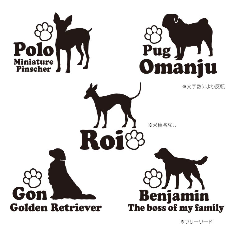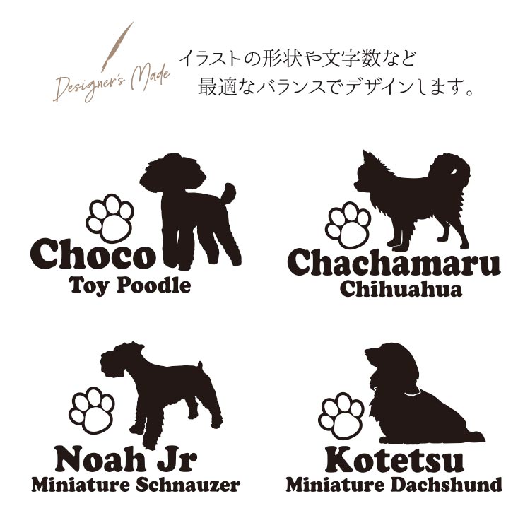 概 要 商品内容 <セミオーダー>名入れシルエットステッカー / 1枚 <貼り方マニュアル>簡単ステッカー貼り方講座 タイプ 名入れドッグシルエット[スタンダードタイプ] 単色 右向き ・ 左向き サイズ 縦110mm×横150mm以内 または 縦90mm×横125mm以内 ★犬種・名前の文字数により縦横バランスが異なるため、サイズ内の縦または横の、いずれかがいっぱいになるサイズで製作します。 ★上記の理由によりサンプルと異なる印象となる場合がございます。 ご心配なお客様にはご連絡いただいたメールアドレス宛てに仕上り図案をPDFにてお送りし、了解の上で実製作いたします。 材質・特長 塩化ビニール製(看板用シート素材) 屋外耐候5年以上 イラスト・文字のみの図形ステッカー 剥がし方 本ステッカーは時間の経過とともに固着します。剥がす時は糊を残さないためにも、 ホームセンター等で販売されているシール剥がし剤をご利用いただくことをお奨めします。 商品説明 弊社のデザインパターンに沿い、お客様の飼っている愛犬に合せ、犬種名・シルエット・お名前で製作するセミオーダーステッカーです。 シルエットの形状や犬種名・お名前の文字数により縦横のバランスが一つ一つ異なりますので、弊社デザイナーがバランスを見て一枚一枚こだわって制作いたします。雑種犬・MIX犬等を含み、最も似たシルエットを一覧表より、ご自由にお選び下さい。 用途 クルマのリヤガラスでのご利用が多く見られますが、犬小屋、ケージ、ご自宅内のいたる所でご利用いただけます。 注意事項 ★表面に細かな凹凸がある物や、石・コンクリートなど表面にザラついた物、細かなエンボス加工や撥水加工された壁クロスなどには貼れません。 ★貼る前に練習用ステッカーをお試しの上で本ステッカーをお貼りください。 ★剥がす時はホームセンター等で販売されているシール剥がし剤をご利用ください。 犬種 シルエットはさまざまな犬種をご用意しており、同じ犬種でも複数パターンあります! その数は160種超! アイリッシュウルフハウンド,秋田犬,アフガンハウンド,アメリカンコッカースパニエル,アラスカンマラミュート,イタリアングレーハウンド,イングリッシュコッカースパニエル,イングリッシュセッター,イングリッシュポインター,ウィペット,ウェルシュコーギーペンブローク,ウェルシュテリア,エアデールテリア,カニンヘンダックスフンド,キャバリア,グレートデン,グレートピレニーズ,ゴールデンレトリバー,サモエド,サルーキ,シーズー,シェットランドシープドッグ,柴犬,シベリアンハスキー,ジャーマンシェパードドッグ,ジャックラッセルテリア,スムースチワワ,セントバーナード,タイニープードル,ダルメシアン,チャウチャウ,チワワ,ティーカッププードル,トイプードル,ドーベルマン,パグ,バセットハウンド,パピヨン,ビーグル,ビションフリーゼ,ブルドッグ,フレンチブルドッグ,ペキニーズ,ボーダーコリー,ボクサー,ボストンテリア,ポメラニアン,ボルゾイ,豆柴,マルチーズ,ミディアムプードル,ミニチュアシュナウザー,ミニチュアダックスフンド,ミニチュアピンシャー,ヨークシャーテリア,ラフコリー,ラブラドールレトリバー,レークランドテリア,ロットワイラー,ロングチワワ,ワイヤーフォックステリア 等 ※モニター発色の具合により色合いが異なって見える場合がございます。 ※カッティングシートとは中川ケミカルの登録商標です。本ページでは一般的な総称として記載しています。 ※デザイナーズメイドとは、「カッティングステッカー(文字)」「ラバープリントシート(文字)」などの場合、お客様の指定に沿い、弊社デザイナーが書体の個性・文字間・行間など、最良のレイアウトバランスを整えて製作するものです。また、の他デザインされた製品においても、お選びいただいた商品デザインの基本形を守った上で、デザイナーがバランスの整ったレイアウトを考え、製作するものです。オリジナルのデザインを考案するサービスではございません。予めご理解願います。 ※一部の製品において、弊社内に在庫が欠品している場合など、上記以外に発送まで数日いただく場合がございます。各商品ページに記載の納期をご確認いただくか、お気軽にお問合せください。 【ご注文に関する重要注意事項】 弊社ではお客様からのご注文に、第三者の知的財産権を侵害する内容を認めた場合、そのご注文は弊社の判断でキャンセルさせていただく場合がございます。 また、弊社ではお客様からのご注文内容に、知的財産権の侵害など第三者に対するすべての権利侵害の内容が含まれていない事をチェックする事は出来ません。 よって、お客様からのご注文で発生の第三者に対する権利侵害、その他から生じた第三者との間で生じたトラブル、紛争、責任、保障(それらから生じた一切の費用負担)につきましては、すべてお客様の責任で負担・処理するものとし、弊社では一切の責任を負いかねますことご承知の上でのご注文