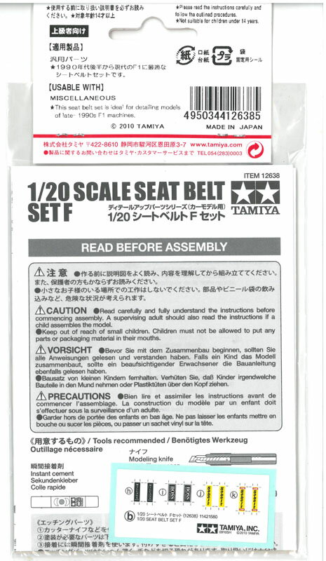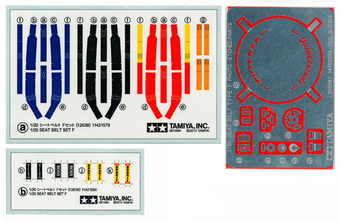 1/20 シートベルト Fセット【タミヤ ディテールアップパーツ(カーモデル用) Item12638】 ●エッチング製バックルとベルトシートで現代F1モデルのコクピットの完成度をさらに高めます。 ●ベルトは青、赤、黒の3色で3メーカーのロゴも用意。 ●ブリヂストンタイヤ用ステンシルもセット。 【 装着可能製品 】 ●Item20055 1/20 ウイリアムズ BMW FW24 ●Item20052 1/20 フェラーリ F2001 ●Item20048 1/20 フェラーリ F1-2000 ●Item20046 1/20 マクラーレンMP4/13 ●Item20045 1/20 フェラーリ F310B ●Item20038 1/20 ロータス 107B フォード ●Item20036 1/20 ベネトン フォード B192