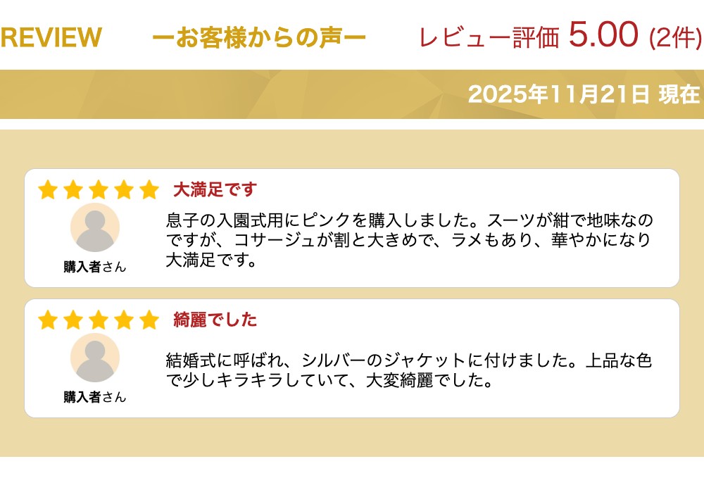 素材金具:合金 花びら部:合成繊維、ラインストーン、アクリルビーズ・パールサイズ直径約11cm ※平置きの実寸サイズです。製品により多少の誤差が生じる場合がございます。 重さ:約10gカラーピンク・ホワイト・ブルー商品お届け荷姿当社スタッフがしっかりと検品し確認して出荷いたします。 型崩れが発生しないよう専用のBOXケースに入れて、発送いたします。注意点※モニター発色の具合により、実際のものと色合いが異なる場合があります。 ※一つ一つ職人が手作りで生産しております、そのため色合いやサイズ等、若干の個体差がございますのでご了承願います。 ※デザイン上、一部生地を裁ち切りしております。生地のほつれ等が気になる場合は、無理に引っ張らずにその部分をハサミ等で取り除いてください。内容■職人の手作りコサージュ こちらの商品は職人がひとつひとつ丁寧に仕上げた手作りコサージュです。 ■キラキララメのシフォン生地 シルバーラメをあしらったシフォン生地を重ねてふんわりとした印象をエレガントに仕上げています。 ■合わせやすいナチュラルカラー どんなお洋服にも合わせやすいナチュラルカラーはさりげなく胸元をエレガントに彩ります。卒業式、入学式、結婚式、パーティーなど多くのシーンで大変重宝いたします。 ■使いやすいサイズ 直径約11cmと使いやすいサイズです。商品の重量は約10グラムととても軽いので、胸元の重さを感じさせません。金具は、ピンタイプです。ご利用シーン入園式 入学式 卒園式 卒業式 結婚式2次会 パーティ フォーマル 演奏会 発表会 記念式典 お呼ばれ カジュアル 普段使い生産国中国 ※検品・梱包は日本で実施しています。配送ゆうパックまたは宅配便 ※複数お買い上げの場合は配送方法が変更になる場合もございます。詳しくはコチラ卒業式 入学式 卒園式 入園式 入学式 卒業式 フォーマル ママ 母 妻 20代 30代 40代 50代 60代 フェミニン 華やか 発表会 七五三 参観日 披露宴 謝恩会 結婚式 二次会 同窓会 パーティー お呼ばれ 贈り物 使いやすい 春 夏 秋 冬 成人式 髪飾り ヘアアレンジ ヘッドドレス 高見え リッチ 上品 特別 フラワー バラ 薔薇 百合 ダリア ピオニー ブーケ 花束 ロマンティック 女性らしい ドライフラワー アーティフィシャルフラワー ハンドメイド 美しい コサージュ 関連商品【SALE開始40%OFFクーポン配布中★本日20:00〜開催】★1位...【SALE開始40%OFFクーポン配布中★本日20:00〜開催】★1位...【SALE開始40%OFFクーポン配布中★本日20:00〜開催】★1位...2,420円2,640円2,530円【SALE開始40%OFFクーポン配布中★本日20:00〜開催】★1位...【SALE開始40%OFFクーポン配布中★本日20:00〜開催】ローズ...【SALE開始40%OFFクーポン配布中★本日20:00〜開催】★1位...2,640円2,530円2,530円【SALE開始40%OFFクーポン配布中★本日20:00〜開催】ふんわ...【SALE開始40%OFFクーポン配布中★本日20:00〜開催】★1位...【SALE開始40%OFFクーポン配布中★本日20:00〜開催】★1位...2,530円2,772円2,728円【SALE開始40%OFFクーポン配布中★本日20:00〜開催】★1位...【SALE開始40%OFFクーポン配布中★本日20:00〜開催】★1位...【SALE開始40%OFFクーポン配布中★本日20:00〜開催】★1位...2,750円2,805円2,728円ラメ シフォン コサージュ ブローチ ピン クリップ 2WAY フォーマル 入学式 入園式 卒業式 卒園式 結婚式 お呼ばれ 華やか クレインズコレクション 結婚式 入園式 入学式 卒園式 卒業式 パーティー 発表会 フォーマル お呼ばれ ピン クリップ ブローチ 2WAY カジュアル 二次会 同窓会 さまざまなご利用シーンで! ■キラキララメのシフォン生地シルバーラメをあしらったシフォン生地を重ねてふんわりとした印象をエレガントに仕上げています。■合わせやすいナチュラルカラー柔らかな印象のナチュラルカラーなのでお洋服を選ばず様々なシーンでお使いいただけます。卒業式、入学式、結婚式、パーティーなど多くのシーンで大変重宝いたします。■使いやすいサイズ直径約11cmと使いやすいサイズです。商品の重量は約10グラムととても軽いので、胸元の重さを感じさせません。金具は、ピンタイプです。外付けクリッププレゼント!■ご利用シーン入園式 入学式 卒園式 卒業式 結婚式 2次会 パーティ フォーマル 演奏会 発表会 記念式典 普段使い カジュアルに■専用のBOXケースに入れて発送しますので型崩れの心配はありません。