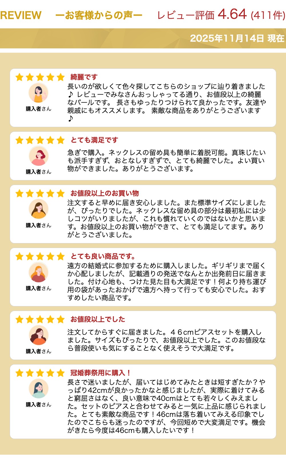 素材パール:国産クリスタルガラスパール ※パール珠の核にクリスタルガラスを使用し、パール塗装を施した人工真珠のこと ・パール珠:8mm国産クリスタルガラスパール ・ネックレス:日本製糸(ポリエステル)使用 ・カラー:ナチュラルホワイト(あらゆるシーンで使いやすいカラーです) ・ロゴ入り巾着袋をプレゼント!サイズ■フォーマルな装いに合わせやすい 8mm パール珠を採用。ネックレスの長さは 6種類を用意しました。 ・40cm:華奢な方にもジャストのチョーカーサイズ ・42cm:プリンセスサイズといわれる一般的なサイズ ・46cm:ややゆったりと身につけたい方にオススメ ・50cm:締め付けが苦手な方へゆったりサイズ ・56cm:お出かけやお祝い事にも使用したい方へマチネサイズ ・60cm:ゆったりとカジュアルでもお使いいただけるロングサイズです。 ※一般的にプリンセスサイズと呼ばれる40cm〜46cmの長さのネックレスは、チョーカーの40cmサイズと鎖骨あたりにフィットする42cm46cmサイズになります。冠婚葬祭でつけるパールネックレスは、この長さが一般的です。どんな方にも似合う長さで、自然な印象なので、つける機会の多いネックレスです。はじめてのパールネックレスには、この長さがおすすめです。 ※ゆったりサイズがお好みのお客様へ、50cmと56cmの長さのネックレスをご用意いたしました。冠婚葬祭以外のお出かけでもご使用されたい方や締め付けが苦手な方にはこちらの長さがオススメです。カラーナチュラルホワイトパール商品お届け荷姿当社スタッフがしっかりと検品し確認して出荷いたします。 傷のつきにくい包装に加え、ロゴ入り巾着ケースに入れ、発送いたします。注意点※モニター発色の具合により、実際のものと色合いが異なる場合があります。 ※一つ一つ職人が手作りで生産しております、そのため若干の個体差がございますのでご了承願います。 ※万が一初期不良があった際は無償で交換させていただきます。到着後7日以内の商品に限ります。 ※通常保障やレビュー保障で返品や修理を希望される場合、弊社へ発送していただく際の送料はご負担をお願い致します。内容■さまざまなシーンで活躍! 結婚式や卒入式などのハレの日や葬儀、告別式、法事などの仏事といったあらゆるフォーマル シーンにふさわしいパールセットです。落ち着いた色のため、フォーマルスーツ、ドレス、喪服などのあらゆる装いに大人気の パールセット です。 ■使いやすいサイズとお買い得セット! フォーマル な装いに合わせやすい 8mm パール珠を採用。ネックレスの長さは 40/42/46/50/56/60の6サイズを用意。さらに同じパール珠を使用したイヤリング・ピアスもセットに! おしゃれなネックレスの留め具を採用 ■素材、金具、組み付けともに国内の職人が手作業で生産しております。国産の留め金具はおしゃれなローズモチーフで高級感を演出。永くご愛用いただけるアイテムです。 ■コストパフォーマンスに優れたパールアクセサリー 汗や汚れに強く、耐久性に優れているため、コストパフォーマンスに優れたアクセサリーです。黄ばみや変色の心配がないため夏場でも気軽に使用でできます。 ■安心の国内自社生産 素材選び、企画、製造、販売とすべて自社生産のため、高品質低価格でご提供しております。専用のロゴ入り巾着袋に入れて、丁寧に梱包しご提供します。 ■金属アレルギーを起こしにくいピアス金具を採用 ピアスポスト&キャッチはアレルギーフリーの国産サージカルステンレスを使用しています。 ※万が一かぶれやかゆみ等を感じた際は、ご使用をおやめいただきますようお願いいたします。 ※固めのステンレスキャッチが気になる方のために、花形のシリコンキャッチも同梱します!!保証内容■\レビューを書いて手厚い保証をGET/ ・30日以内のネックレスサイズ交換・返品を承ります (ご依頼時の送料はご負担ください) (50cm、56cm、60cmに関しては価格が異なるため、短い長さへの交換対応のみ実施しております。) ・商品に不具合があった場合、6ヵ月以内は無償対応 (ご依頼時の送料はご負担ください) ・お問い合わせは24時間以内にが対応致します (土・日・祝日を除く)ご利用シーン入園式 入学式 卒園式 卒業式 結婚式2次会 パーティ フォーマル カジュアル 演奏会 発表会 イベント 葬式 法事 葬儀 記念式典 お呼ばれ 普段使い生産国日本 ※企画・生産から検品・梱包まで一貫して自社で実施しています配送メール便 ※複数お買い上げの場合は配送方法が変更になる場合もございます。詳しくはコチラ関連キーワード【関連キーワード】パールネックレス 真珠 パールピアス パールイヤリング 冠婚葬祭 結婚式 パーティー 入学式 入園式 卒業式 卒園式 ハレの日 発表会 同窓会 セレモニー 葬式 法事 慶事 弔事 セット アクセサリー 就職祝い 進学祝い 新生活 ギフト プレゼント 人工真珠 人工パール 8mmネックレス 人気 ランキング フォーマルネックレスセット パールネックレスセット おしゃれ お洒