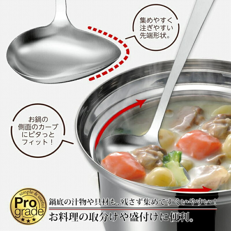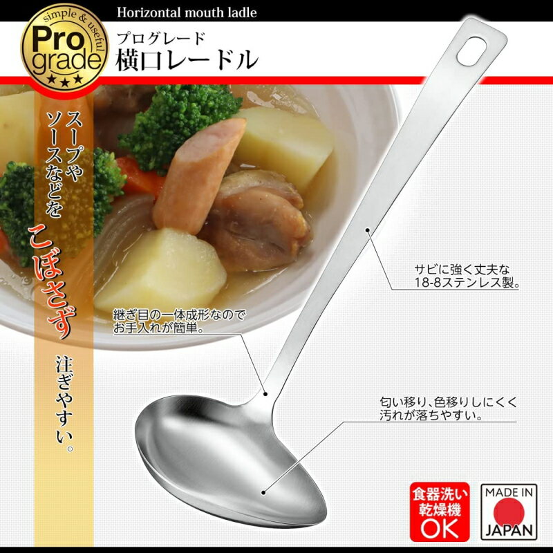 ≪おすすめポイント≫ ・盛り付けに便利なそそぎ口が付いたお玉。 ・スープジャーなど細い口径の容器にも零さずに注げます。・側面が長くお鍋の底にフィットし、カレーなど最後まできれいに掬えます。・お鍋の側面にフィットし、あくをささっと掬えます。・容量は、ご家庭用の一般的サイズの75mlになります。 <商品仕様> ■サイズ(約):幅104×奥行52×高286mm ■容 量:75ml ■重 量:約110g ■材 質:18-8ステンレス ■食器洗浄機に使用できます。 ■生産国:日本、下村工業製 ●他のお玉・レードルはこちら ●プログレード他のアイテムはこちら■プログレード 横口レードル PG-205
