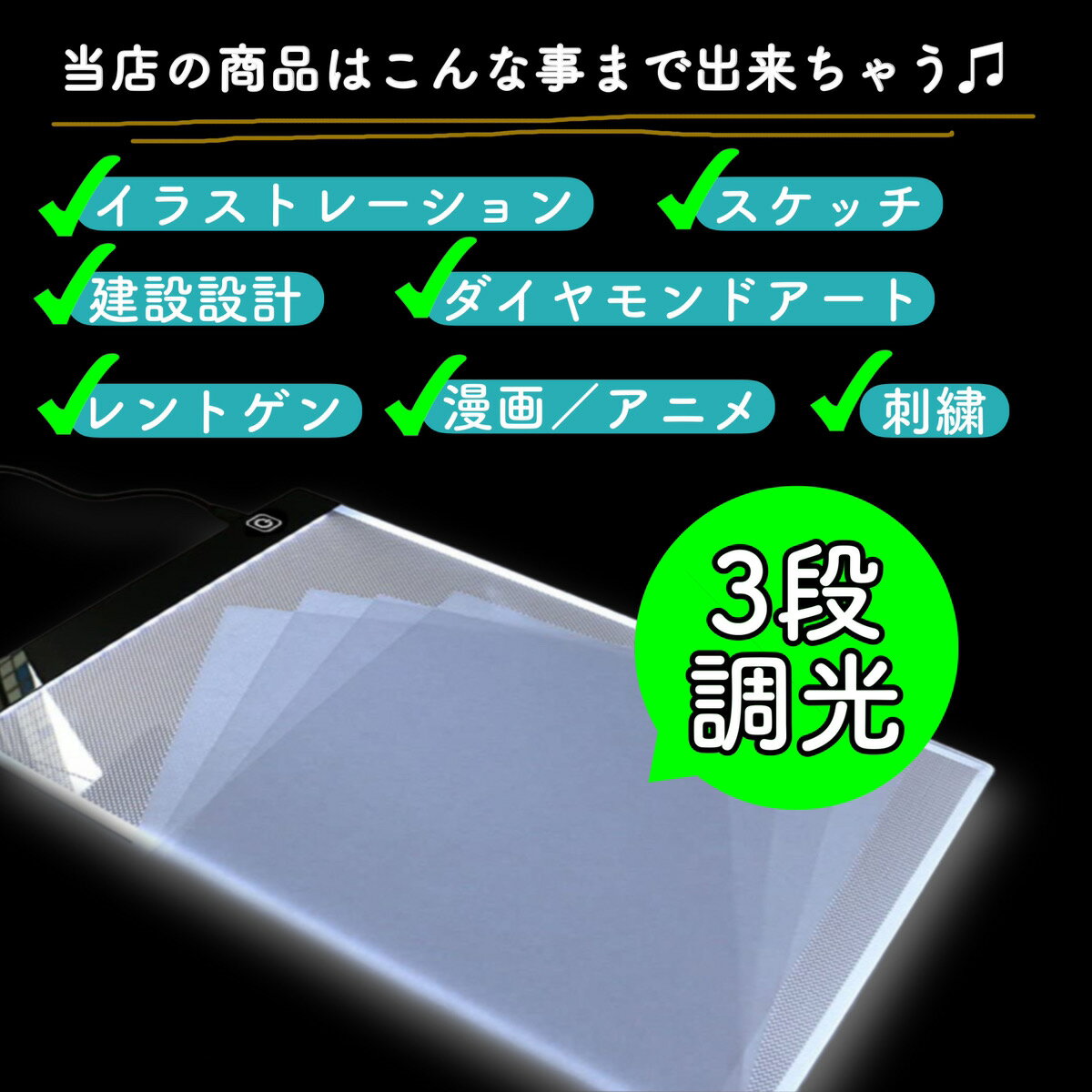 トレース台 ライトテーブル A4 LED ダイヤモンドアート 光る ト ースボード USB 写し絵 ライト 調光 軽量 漫画 イラスト 製図 写経 アニメ トレース ダイヤモンドアート送料無料!超薄型A4サイズのLEDトレース台 超薄型A4サイズのLEDトレース台です。 ■USB給電でいつでもどこでもご使用可能◎USBケーブル付き ■薄型・軽量設計で持ち運びも楽々♪ ■ライトは3段階で調光可能!お好みの明るさでご使用いただけます ■輝度が高く寿命が長いLEDを使用しています アニメ、マンガ、スケッチ、イラスト、写経、製図など様々な場面で大活躍! 様々な場面でおススメです。 【サイズ】A4サイズ / A5サイズトレース台 ライトテーブル A4 LED ダイヤモンドアート 光る ト ースボード USB 写し絵 ライト 調光 軽量 漫画 イラスト 製図 写経 アニメ トレース ダイヤモンドアート 送料無料!超薄型A4サイズのLEDトレース台 超薄型A4サイズのLEDトレース台です。 ■USB給電でいつでもどこでもご使用可能◎USBケーブル付き ■薄型・軽量設計で持ち運びも楽々♪ ■ライトは3段階で調光可能!お好みの明るさでご使用いただけます ■輝度が高く寿命が長いLEDを使用しています アニメ、マンガ、スケッチ、イラスト、写経、製図など様々な場面で大活躍! 様々な場面でおススメです。 【サイズ】A4サイズ / A5サイズ 5
