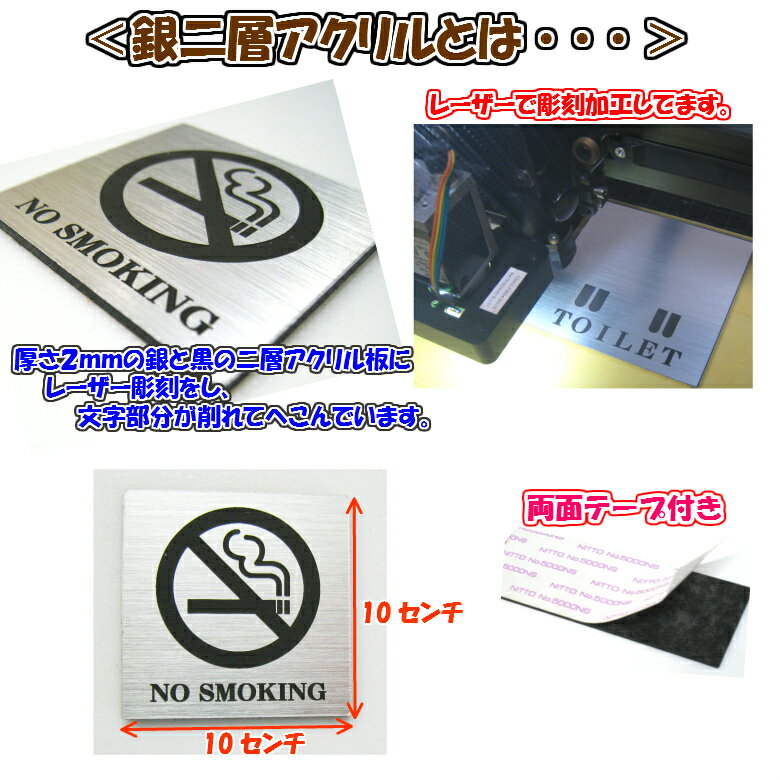 【メール便商品】禁煙プレート 10cm角 6種類 銀二層アクリル製(全面両面テープ付) 【くらふと工房クレアル 彫刻 レーザー デコボコ、プレート、マナー、案内、表示】