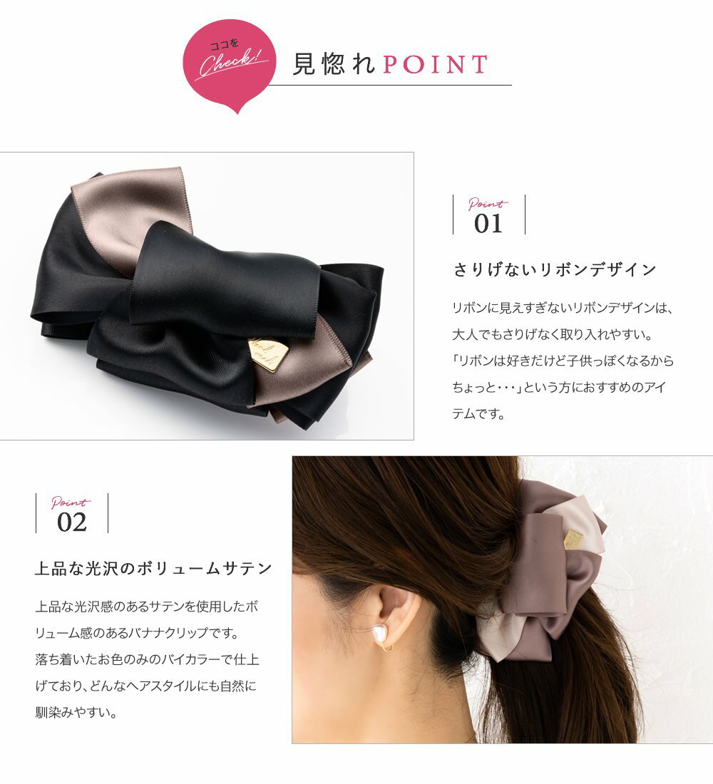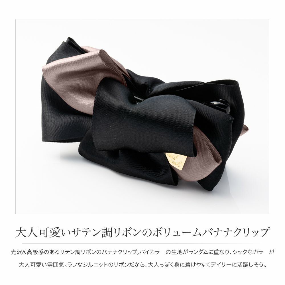 【一部予約:1月上旬】【全品送料無料×P最大47倍!】バナナクリップ 大きめ しっかり留まる リボン サテン調 光沢 ボリューム 大きめ バイカラー ヘアクリップ ヘアアクセサリー 髪留め まとめ髪 大人 ブラック ベージュ