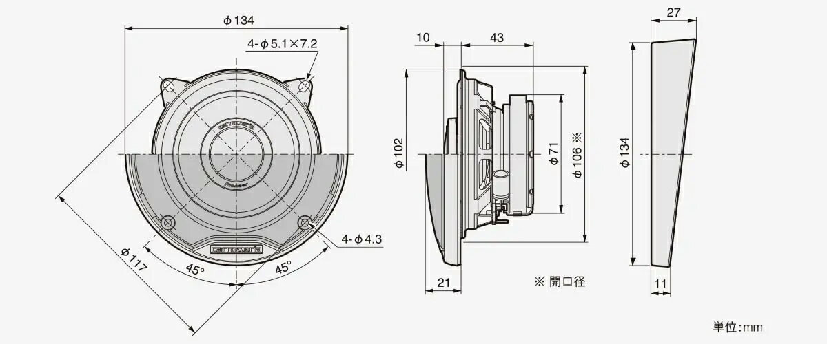 「ユニットスピーカー」とは 薄型設計で、専用のグリルネットを同梱しているので、スピーカーが設置されてない ドアや天井、リアトレイなど様々な場所に安心して取付できるスピーカーです。 幅広い車種で高音質化を実現する、フレキシブルな取付性 「Open & Smooth」コンセプトを採用 理想の音場を実現するため低歪みと指向性に優れた “中音域は指向性に優れたトゥイーターから再生する”「Open & Smooth」コンセプトを採用し、 空間描写力と臨場感を演出する「ハイレゾ」再生にも対応。 中域から超高域までの緻密な音を正確に描写するトゥイーター部 小口径でも充実した中低域と力強いサウンドを実現するウーファー部 商品説明 ・カロッツェリアのユニットスピーカー、TS-E1010です。 ・柔軟な取付性に加え、空間描写と臨場感を実現する高音質10cmコアキシャル2ウェイユニットスピーカーです。 ・多彩な車種に取付けが可能なユニットタイプのスピーカー。振動板・エッジの損傷やホコリなどの侵入からスピーカーを保護する、専用のグリルネットを同梱。さらに、本体が薄型・防水仕様に設計されているため、ドア、天井、リアトレイなど好みのスペース、アイデア次第で様々な場所に設置できます。 ・トゥイーターから中域までも再生し、車室内での中域の減衰や乱れを解消する「Open & Smooth」コンセプトを採用し、減衰しがちな高域の音圧を保ちつつ車室内においても広指向特性を獲得。セパレートスピーカーに迫る明確な前方定位を実現し、情報量豊かなハイレゾ音源をより解像度高く、精緻に表現します。それにより、厚みと輪郭のある中域再生を実現し、まるで音に包みこまれるような感覚と目の前で演奏しているような臨場感が得られます。 ・奥行のない場所にも取付できるスラントスペーサーと、スピーカーを保護するグリルネットが付属しています。 製品仕様 ・スピーカー構成:10cm アラミドファイバーコーンウーファー / 2.9cm バランスドドームトゥイーター ・瞬間最大入力:110W ・定格入力:25 W ・再生周波数帯域:50Hz~64,000Hz ・出力音圧レベル:88dB ・インピーダンス:4Ω ・質量(付属品を含む1個):0.57 kg 付属品 ネジ(Φ4mm×16mm)×8 スピードナット×8 ネジ(Φ4mm×14mm)×8 スペーサー×2 グリル×2スピーカーの能力を最大限引き出す!! デッドニングキットもぜひご一緒に!! スピーカーを交換する。 もちろんそれだけでも大幅な音質向上が可能ですが、さらにスピーカーの能力を引き出すのがデッドニング。 ドアの振動や音漏れを防ぎ、ドア全体をスピーカーボックス化することで今まで聴こえなかった繊細かつ迫力ある音が実現できます!! カロッツェリア UD-S701 はじめてのデッドニングにも最適! スピーカー裏の音を効率的に反射・吸収し、音のヌケ感を向上させる定番アイテム。 貼るだけ簡単、コスパ重視の方にぴったりの「お試しデッドニング」におすすめ! 当店オリジナル CR7400 【オーディオテクニカ部材使用】 迷ったらコレ! バランス重視のスタンダードモデル ドア2枚分に対応し、吸音・防振をバランスよくサポート。 初めての施工でも安心な内容量で、音質改善にも効果的! オーディオテクニカ AT-AQ409 静音も音質もとことん追求! ハイグレードモデル 高性能・高密度素材を贅沢に使用し、大きめ車両や徹底的な静音化を目指す方に最適。 プロユースに近い仕上がりが叶う一品。 ※画像はイメージです。