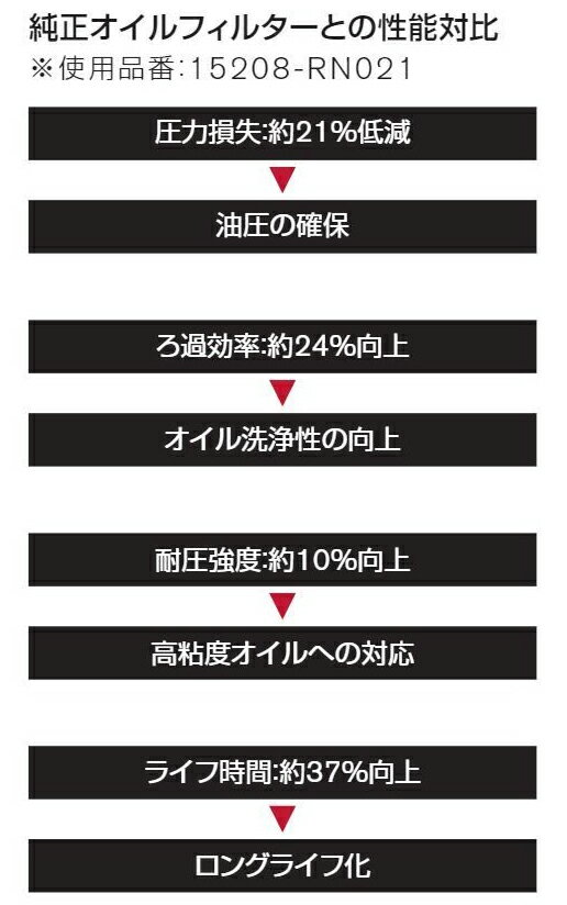 商品説明 ・NISMOのオイルフィルター、15208RN011です。 ・オイルフィルターのろ過面積を大きくすることにより、圧力損失の低下やろ過効率の向上、ロングライフ化を実現しました。これにより油圧を安定化させ、スラッジによるエンジン内部の汚れを減少させます。 また耐圧強度向上により高粘度エンジンオイルにも十分対応します。 ・NISMOオイルフィルターは、奥に行くほどフィルターの目が細かくなる「密度勾配構造」を採用。 大きな汚れの粒子は表面で、細かい粒子は奥の方でキャッチするので、目詰まりしにくく、純正商品に比べ、時間が経過してもろ過機能が維持されます。同時にろ紙形状を最適化することで有効面積を大きくし、ろ過効率の向上を実現しました。 ・「密度勾配構造」によって、ゴミを段階的に除去することで、目詰まりを遅らせ、ロングライフ化を実現しました。 【対応純正品番】 AY100-NS004 / 15208-65F00 / 15208-65F01 >>COMPETITION OIL ラインナップはこちらから!<< タグ1:【SBT00527】/タグ2:【SBT00575】/適合車種 車種 型式 エンジン型式 シーマ F50 VQ30DET キューブ / キューブキュービック Z11 / GZ11 HR15DE キューブ Z12 HR15DE エルグランド E50 VQ35DE E51 VQ25DE / VQ35DE E52 QR25DE / VQ35DE フェアレディZ Z33 / Z34 VQ35DE / VQ35HR / VQ37HR フーガ Y50 VQ25DE / VQ25HR / VQ35DE / VQ35HR Y51 VQ25HR / VQ35HR / VQ37VHR ラフェスタ B30 MR20DE マーチ K12 HR15DE K13 HR12DE / HR15DE ムラーノ Z50 / Z51 QR25DE / VQ35DE ノート E11 HR15DE / HR16DE E12 HR12DE (-EM57) / HR12DDR / HR16DE ノート / ノートオーラ E13 HR12DE-EM47 (-MM48) NV350キャラバン E26 QR20DE / QR25DE パルサー N15 SR16VE / SR18DE セレナ C24 SR20DE / QR20DE / QR25DE C25 MR20DE C26 / C27 MR20DD / HR12DE (-EM57) シルビア / 180SX S14 / S15 SR20DE (T) スカイライン / スカイラインGT-R V36 / CKV36 / V35 / CPV35 VQ25DD / VQ25HR / VQ30DD / VQ35DE / VQ35HR / VQ37HR V37 VQ35HR ステージア M35 VQ25DD / VQ25DET / VQ30DD / VQ35DE ティアナ J31 / J32 VQ23DE / QR25DE / VQ35DE ティーダ / ティーダラティオ C11 / SC11 HR15DE / HR16DE / MR18DE ウイングロード / ADバン Y11 QG13DE / QG15DE / QG18DE (N) / SR20VE / QR20DE Y12 HR15DE / MR18DE エクストレイル T30 QR20DE / SR20VET T31 QR25DE / MR20DE T32 MR20DD ※適合につきましては2024年3月現在のメーカー適合を元に記載いたしております。「~現在」の表記はその時点での確認であり、モデルチェンジ等により適合が変更される可能性も御座いますのでご了承くださいませ。 また、いかなる場合におきましても適合の正確性につきましてはメーカー適合を優先とさせていただきます。必ずメーカーページにて適合を確認の上、購入していただきますようお願いいたします。 ※画像はイメージです。