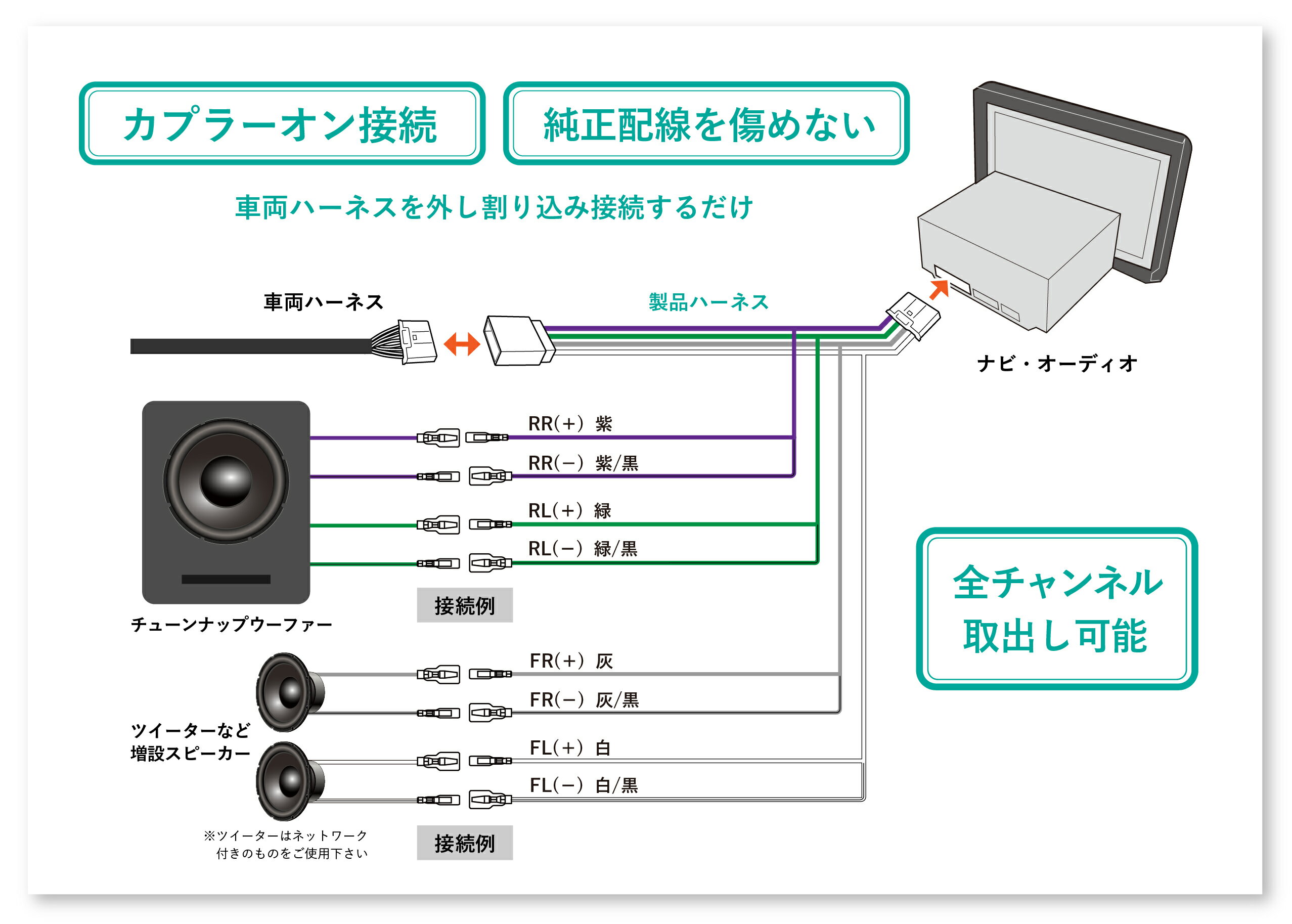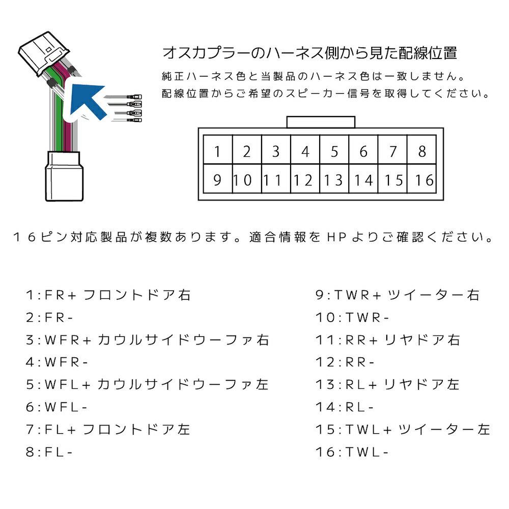 適合情報 車種 年式 型式 CX-30 R1/10~ DM系 CX-60 R4/9~ KH系 MAZDA3 R1/5~ BP系 MAZDA3 セダン/ファストバック R1/5~ BP系 ※BOSEサウンドシステム搭載車非対応 ※適合につきましては2024年6月現在のメーカー適合をもとに記載いたしております。「~現在」の表記はその時点での確認であり、モデルチェンジ等により適合が変更される可能性も御座いますのでご了承くださいませ。 また、いかなる場合におきましても適合の正確性につきましてはメーカー適合を優先とさせていただきます。必ずメーカーページにて適合を確認の上、購入していただきますようお願い致します。 商品説明 ・サイバーストークのスピーカー信号取り出しハーネス (マツダスタンダードオーディオ 16ピン用)、MZS16です。 ・分岐のギボシ配線にサブウーファーやスピーカーを接続しハイレベル信号の取出しが可能です。 ・OFCオーディオグレード銅線使用 ※純正ハーネス色と当製品のハーネス色は一致しません。純正位置を確認の上、ご希望のスピーカー信号を取得してください。 タグ1:【SBT00832】/タグ2:【SBT00856】/※画像はイメージです。