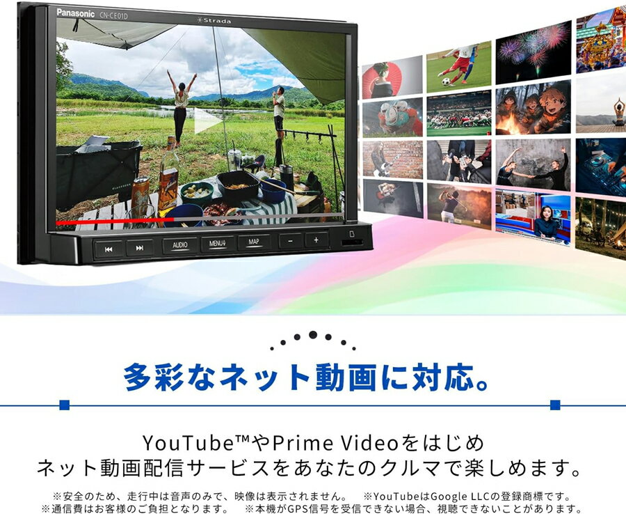 2024年モデル ストラーダ LINEUP!! CN-CE01WD CN-CE01D カーナビゲーション 製品特徴 商品説明 ・パナソニックのストラーダ カーナビゲーション、CN-CE01Dです。 ▼多彩なネット動画に対応 あなたの好きなコンテンツが車内のスキマ時間に楽しめる! YouTube、Prime Video、TVerなどのさまざまな動画配信サービスが視聴可能。スマートフォンのテザリングを使ってWi-Fi接続することで、自宅でいつも見ている映画やアニメ、音楽ビデオなど好きな時にその続きを車内で楽しめます。ケーブル接続も不要でネットの接続があればすぐに視聴が可能です。 ▼HD美次元マップ リアルな表現力の地図表示で快適なドライブをサポート! HD画質を最大限に活かした、繊細でリアルな地図を搭載。平面地図での視認性のみならず、立体表示においては実物に迫るよりリアルな表現で運転中でも見やすく安心です。 ▼スマートフォンのアプリがナビの画面で操作できる Apple CarPlay&Android Autoに対応! スマホアプリをナビで利用できます。しかもワイヤレス対応なので面倒な配線が不要。音声認識を使ってマイクに話しかけることで、前を向いたまま目的地設定や、好きな音楽を選曲して聴いたり、かけたい相手に電話もできます。もちろんUSBケーブルによる有線接続にも対応しています。 ▼ストラーダ専用ドライブレコーダーでさらに安全・安心 前方後方のシーンをHD画質の鮮明な大画面で表示! 専用ドライブレコーダー CA-DR03HTDを連携すると大画面カーナビにHD画質で表示されるので、鮮明な画質で映像を確認することが可能です。後進時の支援も充実し、カーライフをサポートします。 製品スペック(CN-CE01D/CN-CE01WD) 電源 電源電圧:DC12V(試験電圧 13.2V)マイナスアース消費電流:2.5A以下 (AUDIO OFF時) 液晶ディスプレイ 画面寸法(幅×高さ×対角):7V型ワイド 156mm×80mm×175mm 映像入力:RGB(ナビゲーション画面) 画素数:2 764 800 画素(縦720×横1280×3) 有効画素数:99.99% 表示方式:透過型カラーフィルター方式 タッチパネル:抵抗感圧式アナログタイプ(フィルム+ガラス) アンプ 定格出力:18W×4 最大出力:45W×4 適合スピーカーインピーダンス:4Ω(4~8Ω使用可能) ナビゲーションユニット 外形寸法(幅×高さ×奥行き): CN-CE01D:178mm×100mm×184mm(取付奥行き寸法 160mm) CN-CE01WD:206mm×104mm×177mm(取付奥行き寸法 156mm) 質量:1.8kg 動作温度:-10℃~+60℃ 接続端子 カメラ入力レベル:映像:NTSC 1.0Vp-p(75Ω RCAピンジャック)/HD-TVI ビデオ出力レベル:映像:NTSC 1.0Vp-p(75 Ω RCAピンジャック) HDMI入力:HDMI端子1系統(19ピン typeA端子) Wi-Fi 対応規格:IEEE 802.11 a/b/g/n/ac(2.4 GHz/5.2 GHz) 対応チャンネル:1~13 ch / 36~48 ch 対応セキュリティ方式:OPEN / WPA2-Personal / WPA3-Personal おすすめオプション品 ●前後2カメラ ドライブレコーダー:CA-DR03HTD カーナビと連携することにより、ドライブ中に通った景色や運転中の状況をすぐにナビ画面で再生することが出来ます。 ●リアビューカメラ:CY-RC500HD リバース連動で車体後方に設置したカメラの映像をナビ画面にHD画質での表示が可能。鮮明な広い視野角で周囲を確認しながら後退できます。 ●ETC2.0車載器:CY-ET2500VD / CY-ET2505VD 高度化光ビーコンに対応のETC2.0車載器を接続することで高速道路だけでなく一般道の交通情報や信号情報活用運転支援システムを利用することができます。※画像はイメージです。