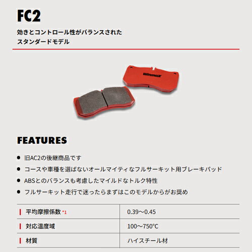 ↓各シリーズへのリンクはこちら↓ 商品説明 ・WinmaXのブレーキパッド FULL CIRCUIT、FC2-580です。 ●FULL CIRCUITシリーズ ・フルサーキットでの走行会、タイムアタック、スプリントレース用ブレーキパッドです。 ・過酷なフルサーキットでの使用に耐えるためフルサーキット走行における車速、減速度、ブレーキ液圧、ロータ温度を考慮し材質設計がされています。 ●FC2 ・効きとコントロール性がバランスされたスタンダードモデルです。 ・[ARMA AC2] の後継商品です。 ・コースや車種を選ばないオールマイティなフルサーキット用ブレーキパッド。 ・ABSとのバランスも考慮したマイルドなトルク特性です。 ・フルサーキット走行で迷ったらまずはこのモデルからがおすすめです。 ●商品仕様 平均摩擦係数:0.39~0.45 対応温度域:100~750℃ 材質:ハイスチール材 ※摩擦係数はWinmaX独自のダイナモ試験結果の数値であり、他メーカー様商品の摩擦係数とは比較出来ません。 ※MC、FC、ERシリーズの摩擦係数は、サーキット走行を想定したダイナモ試験コードでの結果のため、STシリーズとの摩擦係数の比較はできません。 タグ1:【SBT01285】/タグ2:【SBT00319】/↓適合情報↓ ↓本ページと同一適合の商品(シリーズ別)↓ ※画像はイメージです。※詳細な適合につきましては適合情報の案内よりご確認ください。