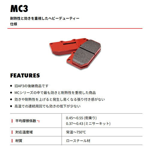 ↓各シリーズへのリンクはこちら↓ 商品説明 ・WinmaXのブレーキパッド MINI CIRCUIT、MC3-846です。 ●MINI CIRCUITシリーズ ・ミニサーキット走行での車速、ロータ温度域、ブレーキ踏力(ブレーキ液圧)等の走行条件に合わせた材質設計をしています。 ・リリースコントロール性に優れるロースチール材を採用しハイグリイプラジアルタイヤとのマッチングも考慮したミニサーキット走行に最適なブレーキパッドです。 ●MC3 ・耐熱性と効きを重視したヘビーデューティー仕様。 ・[ARMAシリーズ AP3] の後継商品です。 ・MCシリーズの中で最も効きと耐熱性を重視した商品です。 ・効きや耐熱性を上げると発生し易くなる張り付き感がありません。 ・高温での連続周回でも効きの低下が少ないです。 ●商品仕様 平均摩擦係数:0.45~0.55(街乗り)、0.37~0.43(サーキット) 対応温度域:常温~750℃ 材質:ロースチール材 ※摩擦係数はWinmaX独自のダイナモ試験結果の数値であり、他メーカー商品の摩擦係数とは比較出来ません。 ※MC、FC、ERシリーズの摩擦係数は、サーキット走行を想定したダイナモ試験コードでの結果のため、STシリーズとの摩擦係数の比較はできません。↓適合情報↓ ↓本ページと同一適合の商品(シリーズ別)↓ ※画像はイメージです。※詳細な適合につきましては適合情報の案内よりご確認ください。