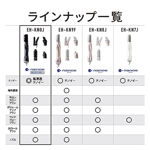 高浸透ナノイー/付属品ブラシ5本・ディープネイビー 1個 (x 1) EH-KN0J-A・・Style:高浸透ナノイー/付属品ブラシ5本・高浸透ナノイーで、髪の内側までうるおいを浸透させながら、なめらかにまとまりよくスタイリング。・従来のナノイーに比べ、水分発生量18倍1の高浸透ナノイー搭載。・5つのアタッチメントと、温風・冷風の使い分けで思い通りのスタイリング。・サロンブローブラシで、しっかりクセを伸ばし、毛先までつややかにまとまる。・1:ナノイーと高浸透ナノイーとの比較(当社調べ)●高浸透ナノイーで、髪の内側までうるおいを浸透させながら、なめらかにまとまりよくスタイリング。 ●従来のナノイーに比べ、水分発生量18倍1の高浸透ナノイー搭載。 ●髪の表面だけでなく、内側にも水分を与え、髪へのうるおい1. 9倍。2(毛髪水分増加量・当社従来ナノイー搭載商品比) ●5つのアタッチメントと、温風・冷風の使い分けで思い通りのスタイリング。 ●サロンブローブラシで、しっかりクセを伸ばし、毛先までつややかにまとまる。 電源コードの長さ:約1.7m アタッチメント :サロンブローブラシ・ボリュームアップブラシ・ワイドブローブラシ・太ロールブラシ・ノズル 本体寸法 :長さ35.8×最大径6.9 cm(ワイドブローブラシ取付時)
