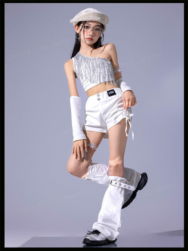 k-pop 衣装 白 キラキラ スパンコール キッズダンス衣装 セットアップ ヒップホップ チアガール へそ出し トップス カーゴパンツ 白パンツ 短パンツ レッグカバー チア衣装 ダンス衣装 キッズ 演出服 発表会 k-pop 韓国 アイドル 衣装 Jazz hiphop ダンスウェア ステージ衣装