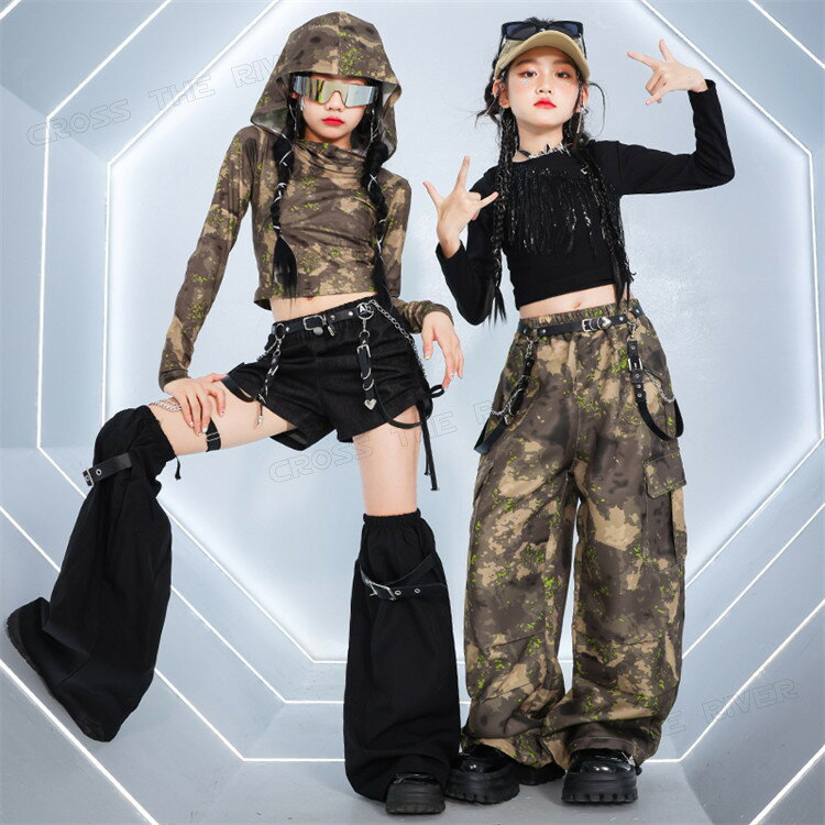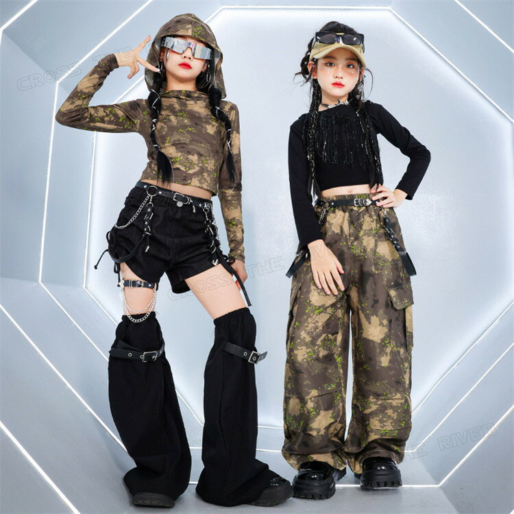 迷彩パンツ 迷彩トップス キッズ ダンス 衣装 へそ出し トップス 女の子 セットアップ かっこいい 韓国 k-pop衣装 ヒップホップ ジャズダンス 長袖 ワイドパンツ 短パンツ 黒 タンクトップ キッズダンス衣装 団体服 イベント 演出服 応援団 ステージ衣装 大きめ 110 170cm