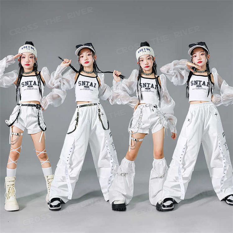 へそ出し トップス メッシュアウター キッズダンス衣装 セットアップ ヒップホップ k-pop 衣装 キャミソール 白 短パンツ レッグカバー ダンス衣装 カーゴパンツ 白パンツ k-pop 韓国 アイドル 衣装 演出服 発表会 原宿系 k-pop Jazz hiphop ダンスウェア ステージ衣装