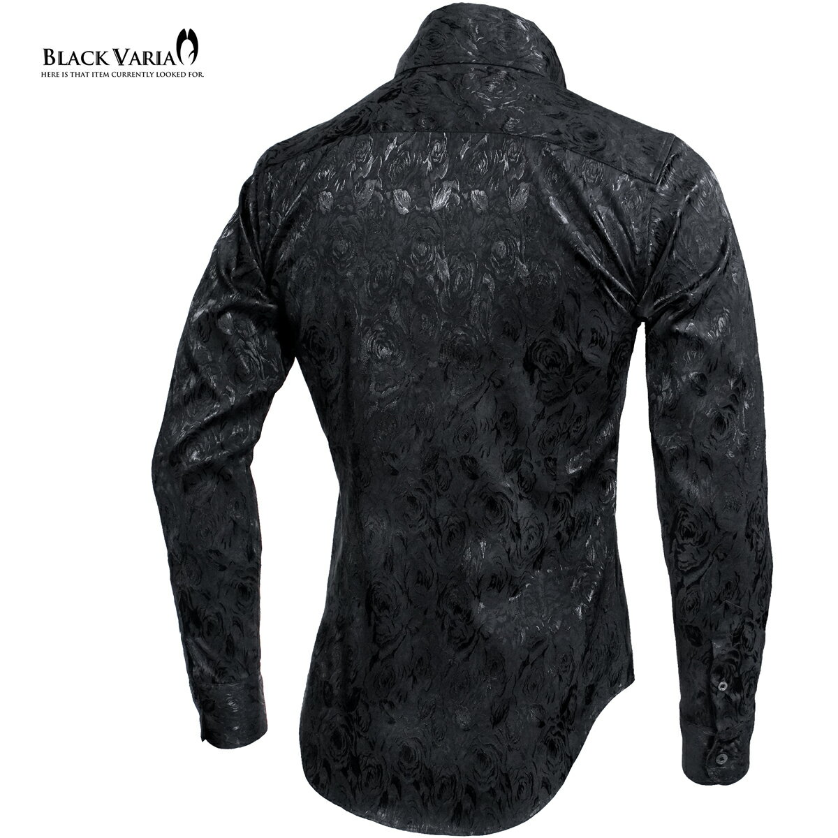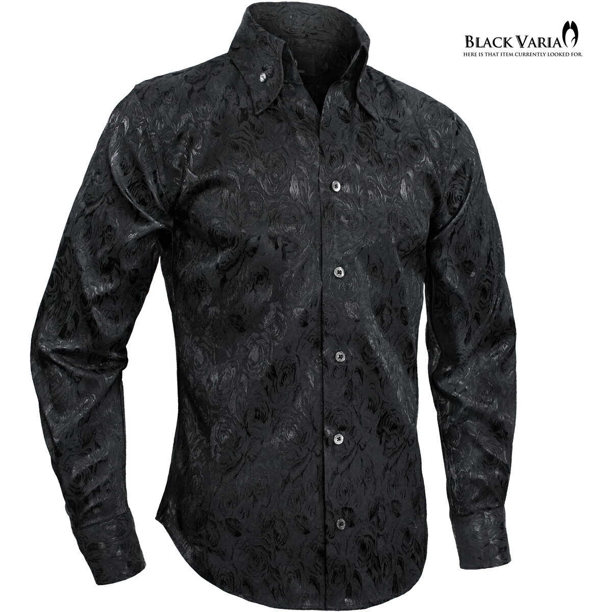 BLACK VARIA ブラックバリア blackvaria サテンシャツ スワロフスキー釦 ドレスシャツ スキッパー 花柄 薔薇 ジャガード 襟高 ボタンダウン スリム 日本製 メンズ 無地 mens ファッション おしゃれ 柄シャツ 派手 (ブラック黒) 191254