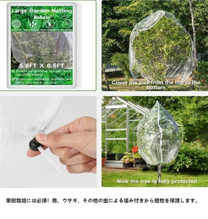 【上質なガーデンネット】植物保護ネットを使用すると、植物を鳥から守りながら、優れた透水性、空気循環の改善、直射日光を実現します。細かいメッシュにより水やりが容易で浸透性に優れ、植物を健全に育て収量の増加につながります。そのユニークな構造は健全な発育を促進し、鳥や天候から保護し、植物の寿命を保証します。 【簡単な植物保護】当社の植物保護ネットを使用すると、植物を鳥から守りながら、優れた透水性、空気循環の改善、直射日光を実現します。細かいメッシュにより水やりが容易で浸透性に優れ、植物を健全に育て収量の増加につながります。 【非常に効果的】手間のかからない作物保護のために、植物保護ネットを植物の上に置き、引き紐をしっかりと引っ張ってセットアップします。ユニークで革新的なデザインの植物保護ネットは、枝を傷つけることなく植物を完全にカバーしますこのネットは、取り付けが簡単な果物保護袋を作成し、毎年再利用できま【ナイ【ナイロンの信頼性】信頼性の高いナイロン素材で作られた柔らかく破れにくい植物保護ネットは、植物を鳥やその他の動物から守るために完全にカバーしており、オーガニックガーデニング愛好家にとって完璧なソリューションです。 【多目的植物ネット】 設置が簡単で広い面積をカバーできます。取り付けが簡単なメッシュネットで作物を保護します。植物、花、トマト、イチゴ、サクランボの保護に広く適用でき、鳥に対する優れた防御効果を発揮します。 【住所不明】 スムーズに商品をお届けできるよう、配送先は詳しく正確にご記入下さい。 配送先不明により荷物が返送された場合は、往復送料及び手数料を請求させていただきます。 交通事情・天候等により、ご指定の日時にお届けできない場合がございますのでご了承下さい。 【在庫について】 システム上、自動的に在庫数を更新の為、更新する反応期間があります。 ご注文のタイミングにより在庫数の更新に間に合わず、商品が欠品となる場合もございます。 欠品となった場合は、その旨をメールにてご連絡させて頂きますのであらかじめご了承ください。 【交換・返品について】 初期不良・破損・品違いで弊社都合で返品交換の場合は商品到着日より7日間以内にご連絡頂ければ無償で交換/返品対応させて頂きます。(七日過ぎた場合は否なる理由でも無償では対応できません) イメージ違いや必要なくなったなどお客様都合で返品・交換の場合は商品代のみの返金となります。 返品先は事務室と異なりますので一度弊社と連絡してから商品を送って下さい。 連絡無しで先に商品を郵送した場合は弊社一切責任負いません。 【商品について】 1.撮影上、環境や光の具合等により、色のイメージが画像と若干異なる場合が御座います。 2.製造上、細かな汚れや傷が発生する場合がございます。度を超して痛みのある場合には弊社までご連絡下さい。 4.出荷完了商品の配達キャンセルはできませんのでキャンセルご希望の場合は早めにメールにてご連絡下さい。 5.配達の事情により危険物や障害物などの検品の関係で商品が開封される場合が御座います。 6.環境保護政策における簡易梱包にご協力をお願い致します。 以上をご了承のうえ、ご注文頂きますようお願い申し上げます。何かご不明な点、ご要望などございましたらメールにてお気軽にお問い合わせしてお願い致します。