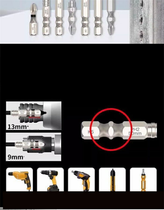 正確さ、耐久性、汎用性のために設計されたツールキットをアップグレードします。これらのドリルビットは、インパクトドライバー、従来のドリル、電気ドライバー、手動ドライバーなど、幅広いツールと互換性があります。 専門家やDIY愛好家に最適なこのセットは、安全で効率的なネジ走行に必要なものをすべて提供します。この精密設計により、ネジを正確にロックおよび修正することができ、作業をより効率的で信頼性を高めることができます。 各ビットには端に強い磁石が装備されているため、滑りや剥がれずに簡単にネジを拾って固定できます。 50mm、65mm、75mm、100mm、120mm、および150mmサイズで利用できるこれらのビットは、磁気減衰なしで繰り返し使用に耐えるように設計されています。 これにより、毎回安全な保留と正確な配置が保証されます。 Wired DrillsまたはWireless Drillを使用しているかどうかにかかわらず、このセットではカバーされています。各ビットの滑り止め歯は、ネジをしっかりと握り、カムアウトと滑りのリスクを軽減します。