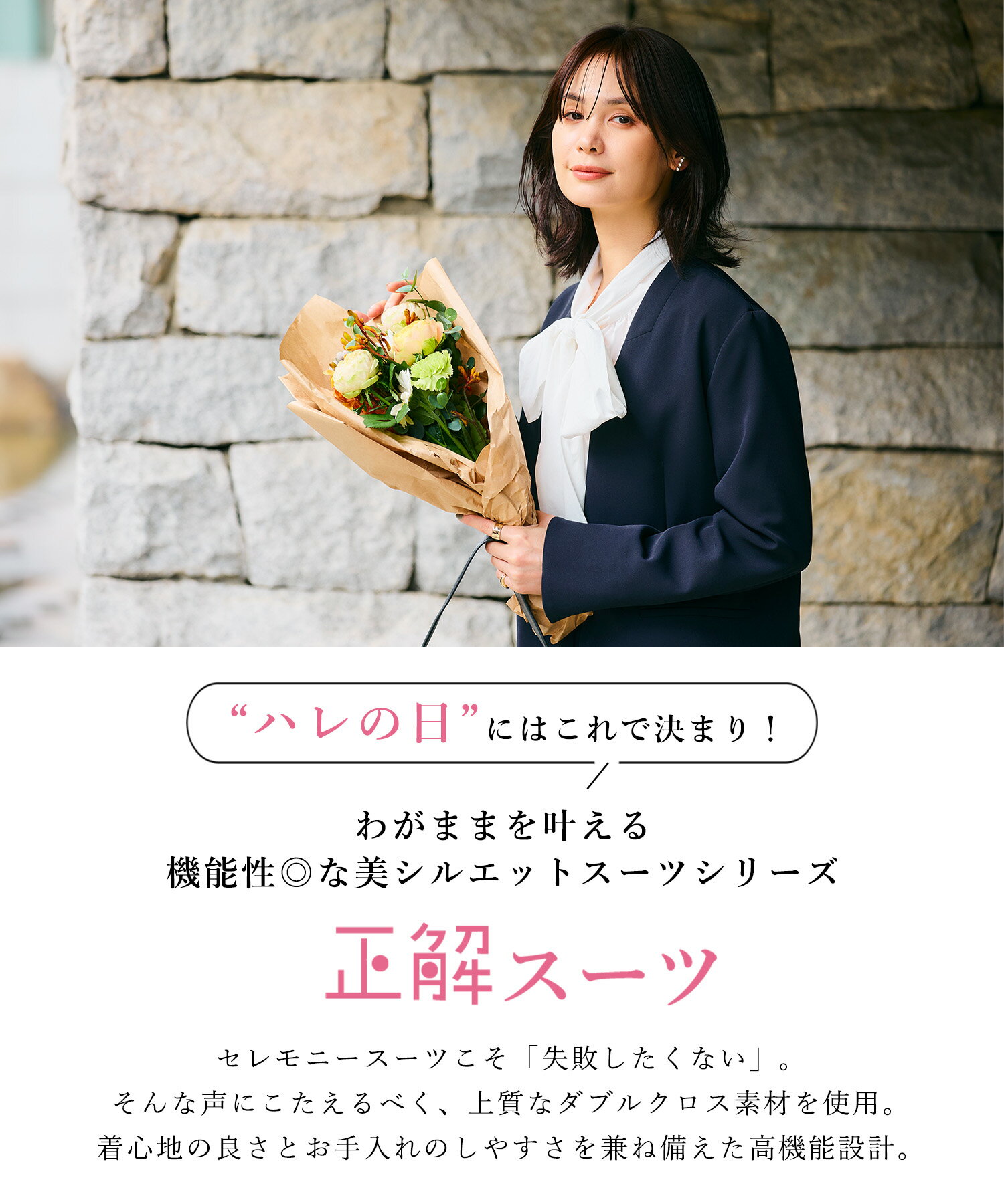 ※メールの設定によってメールが届かない場合がございます。 (特に携帯電話のメールの場合) r-cm@crossplus.netの受信設定をお願いいたします。 《洗える・シワになりにくい》正解ノーカラージャケット【CF/クロスファンクション】 わがままを叶える 機能性◎な美シルエットスーツシリーズ ■正解スーツとは? セレモニースーツこそ「失敗したくない」。 そんな声にこたえるべく、素材には上質なダブルクロスを使用し、着心地もお手入れのしやすさにも抜かりない高機能性を実現。 縦ラインを意識した計算しつくされた美シルエット、「私らしさ」を求めた4つのバリエーション、7号~15号までの豊富なサイズ展開をご用意しています。 《嬉しい4つの機能》 1. 防シワ シワを防ぐ仕様で、いつでもきれいな状態をキープ。 長時間座っていてもシワがつきにくく、セレモニーシーンにも◎お手入れが楽ちんで出張等にも最適です。 2. 洗濯機洗い可能 おうちでお洗濯できるので、汚れてしまってもニオイが気になっても安心。 3. ストレッチ 着心地抜群で動きやすく、スーツ特融の窮屈さを軽減。 4. UVカット UV対策機能付きで紫外線から肌を守ります。 【デザイン】 ・シンプルなデザインだからこそ、きちんと感とリラックス感の絶妙なバランスにこだわったノーカラージャケット。 ・深めのVネックデザインでゆとりのあるシルエットの中にシャープさをプラスし、すっきり見えも叶えてくれる優秀アイテム。 ・ベーシックに仕上げ、オケージョンから通勤まで幅広いシーンで活躍する1着です。 ・気になるウエストや腰回りをカバーしてくれる丈感も嬉しいポイント。 ・袖口にはアクセントのスリット入り。 ・両サイドには便利なポケット付きです。 【コーディネート】 ・合わせるインナーやアウターによってオールシーズン着用可能。様々な行事やシーンで活躍します。 ・ノーカラーなのでどんなブラウスとも合わせやすく、着回し力も万能な1着。 ・大ぶりなリボンボウタイと合わせれば女性らしく華やかに、ベーシックなシャツと合わせてスマートに着こなすのもおすすめです◎ 【サイズ展開】 7号 9号 11号 13号 15号 モデル身長:166cm(ショートヘア)/167cm(ミディアムヘア) 着用サイズ:9号サイズ 【洗濯・取り扱い】 洗濯:洗濯可能(洗濯ネットの使用をおすすめいたします) アイロン:可 乾燥:タンブル乾燥不可 ------------------------------------- 透け感:なし 伸縮性:あり 厚み:普通 裏地:あり 洗濯:可 -------------------------------------- 【素材】 [本体]ポリエステル:90%、ポリウレタン:10% [裏地]ポリエステル:100% 【原産国】 中国 【おすすめ着用シーン】 卒業式 / 卒園式 / 入学式 / 入園式 / セレモニー / ハレの日 / ビジネス / 七五三 / お宮参り/ お呼ばれ / 通勤 【シリーズ展開】 ・単品 正解 Aラインフレアジャケット(品番:954017) 正解 ロングジレ(品番:954018) 正解 ペプラムブラウス(品番:954019) 正解 ノーカラージャケット(品番:954020) 正解 ワイドパンツ(品番:954021) 正解 テーパードパンツ(品番:954022) ※撮影時のライティング、ご覧になっているモニター・PC環境により実際の商品と色味が異なって見える場合がございます。ご了承の上お買い求め下さい。 ※着用画像のコサージュ、バッグはセットではございません。予めご了承ください。 クロスファンクション CROSS FUNCTION cf CF レディース ファッション レディースファッション ウィメンズ ウィメンズファッション ママファッション 楽天 セレモニースーツ 入学式 ママスーツ 卒業式 ママ コーデ セレモニースーツ 入学式 ママスーツ スーツ レディース 卒業式 セットアップ ジレ 卒業式 セットアップ 入園式 スーツ ママ 卒園式 ママ コーデ セットアップ レディース ジャケット レディース 卒業式 ママ オシャレ セレモニー パンツ スーツ レディース 卒業式 スーツ 母 フレア Aライン エーライン AラインフレアジャケットAラインジャケット ジャケット ロングジレ ロング ジレ ペプラムブラウス ペプラム ブラウス ノーカラージャケット ノーカラー ワイドパンツ ワイド テーパードパンツ テーパード パンツ スーツ カラースーツ ビジネススーツ セレモニースーツ フォーマルスーツ カジュアルスーツ セットアップスーツ 発表会ドレス 長袖 袖 膝下 袖あり 七分袖 袖付き 七分 長そで 骨格診断 骨格ナチュラル 骨格ストレート 骨格ウェーブ 体型カバー 着やせ 着痩せ 二の腕 ゆったり ゆるい 痩せて見える S M L LL Sサイズ Mサイズ Lサイズ LLサイズ 低身長向け 低身長 高身長向け 高身長 大きいサイズ 小さいサイズ 大きい 小さい 大きめサイズ 小さめサイズ 大きめ 小さめ スタイルアップ 華奢見え 着痩せ効果 細見え効果 すっきり すっきり見え ウエストシェイプ くびれ 細見え 二の腕細見え 二の腕細カバー 体系カバー ゆったりオーバーサイズ ビッグシルエット シルエット 楽 楽々 楽ちん 楽チン 快適 着心地抜群 着心地 リラックス リラクシー ノンストレス ノーストレス ストレスフリー 軽い 裏地有 