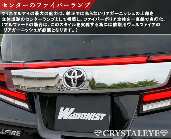 クリスタルアイ 30系ヴェルファイア/アルファード用 ファイバーフルLEDテールランプ クリスタルアイ独自のファイバー技術を利用した業界最高峰の1本でつながるファイバーで 迫力のスタイルを実現します。 センターもファイバーで点灯する5ピース構造。流れるウインカー仕様。 テールランプカラーは、メインカラーのレッドクリアータイプ以外に スモーク/ブラック/クリアータイプの4カラー設定あり ■左右4ピース+センターランプの合計5ピース ■延長ハーネス類一式付属 ■説明書、保証書付属 ■シーケンシャルウインカー仕様(点滅点灯に切り替えスイッチ本体内に内蔵) 【対応車種】 30ヴェルファイア/アルファード※1 通常グレード/ハイブリット オールグレード(2017年12月までの前期型) ※1 アルファードには、ヴェルファイア用のリアガーニッシュが必要です。 (正式名称 バックドア アウタ ガーニッシュ メーカー品番76801-58180) ※リアフォグランプ付き車に装着することも可能です。その場合、純正リアフォグランプは 使用できなくなります。 ※Eマーク取得済み(センターランプ以外)で保安基準に基づいた仕様となりますが 100%車検対応を保証するものではありません。 ※LED切れのみ6ヶ月保証付き (水漏れ保証はございませんので、取り付け前にコーキング施工して下さい。) 【注意事項】 フロントのウインカーをLED化されている又は、当方のLスタイルヘッドライトガーニッシュに 装着されている場合、バッテリーの電圧が低い車輌の場合等 車輌の仕様によりアンサーバック時にウインカーが 正常に流れない場合があります。その場合、ウインカー点滅モードの場合は正常に 点灯しますので、アンサーバック時にウインカーを点灯させたい場合は、点滅モードに 切り替えてご使用ください。 取り付け前に、レンズ合わせ面にコーキング施工をしてください。※センターのランプは未装着もしくは、非点灯も可能です。 ※装着写真はレッドクリアータイプになります。 ※装着写真はレッドタイプになります。 ※装着写真はレッドクリアータイプになります。 ※装着写真はレッドクリアータイプになります。 ※装着写真はクリアータイプになります。