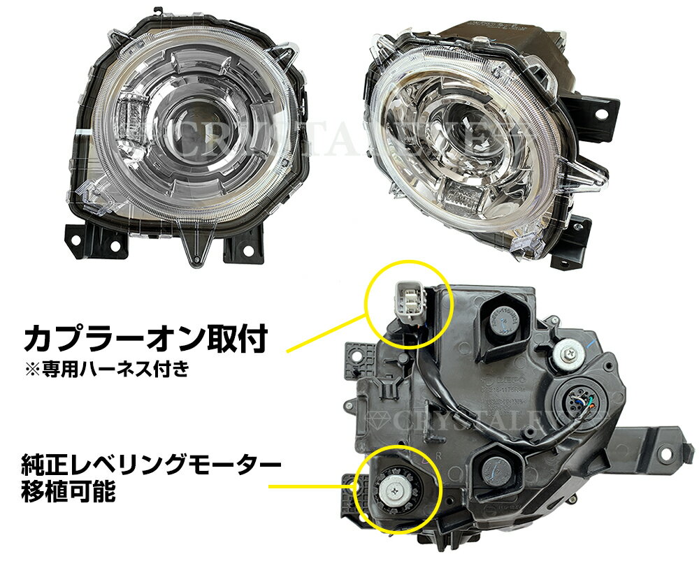 JB64W/74W ジムニー/シエラ 純正タイプ LEDヘッドライト XG/XLグレードのハロゲンヘッドライト車の方に お勧めのLEDヘッドライト(社外品)です。 カプラーONの簡単取付けで純正同等の明るさのLEDヘッドライトに アップグレードが可能です。 ■新品左右セット ■ハロゲンヘッドライト変換ハーネス付属 ■純正レベリングモーター流用可能 適合車種 ジムニー・シエラ JB64W/JB74W 全グレード (ハロゲンヘッドライト(※1)・LEDヘッドライト車共に可能) ※1 2018年7月~2021年9月までの1型 オートライト非搭載車の場合は 市販の変換ハーネスをご使用ください。 ※純正LEDユニット車にも取付け頂けますので 事故修理にもご使用可能です。 ※純正品ではありません。 ※純正レベリングモーターを移植してご使用ください。 ※コーキング施工は必要ありません。