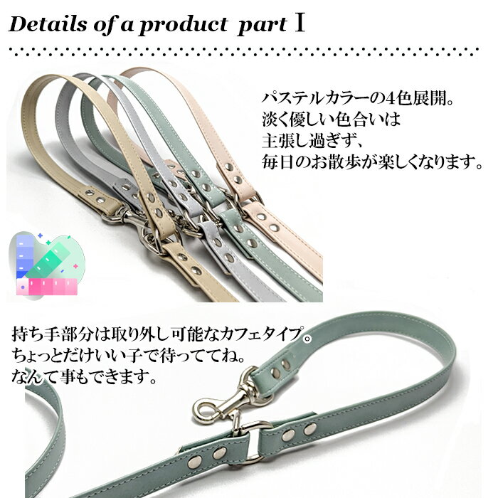 Material  合皮、ナスカン等の金具  Color  4色  Size  リード <全長約120cm 1.0cm/1.5cm幅>  対象:小型犬〜中型犬まで(12kg程度まで推奨)  Related products
