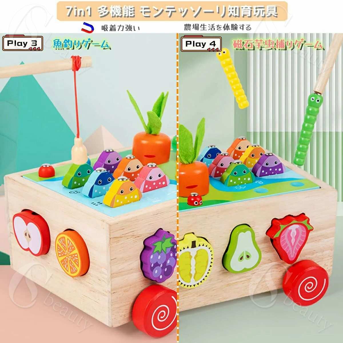 この商品について ●豊富な遊び方:形合わせ はめ込み;釣りおもちゃ;紐通しおもちゃ;おままごとおもちゃ;野菜を取る;害虫を駆除する;遊べる車。豊富な遊び方で飽きずに興味津々遊べるおもちゃです。 ●紐通しおもちゃ・型はめパズルおもちゃ:果物を認知して紐通しおもちゃとしてひもにビーズを通して遊びます。ブロックと穴の形や色を合わせることで、箱にブロックを並べていくおもちゃです。三角形や円などの簡単形だけでなく形に果物の様子をはめ込んでいきます。 ●おままごと木のおもちゃ:野菜を育てながら、最後に大きくなったら切ってみんなに食べましょう!野菜を切るマネができるだけでなく釣竿と魚・虫にマグネット内蔵でぴたっとくっつき、釣り竿でいろんな魚をつりあげよう! ●遊べながらで簡単な勉強もできるタイプ:野菜の形や果物の認識ができます。ブロックのおもちゃは想像力や空間把握力、思考力、集中力など、知育効果の高いおもちゃとして知られています。 ●カラフルな木製のおもちゃ:手になじむ触り心地のよさとぬくもりがあり、木製のパズルは温かみがあるうえに、耐久性に優れるといった特徴があります。色彩感覚も自然に育つよう、カラフルなおもちゃで子供の色の認識を育みます。誕生日、入園祝い、入学祝い 、クリスマスなどのプレゼントにピッタリ!