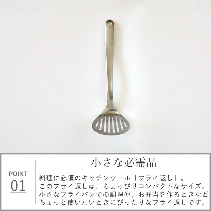 【Size】 幅7.2cm x 高さ22.5cm 持ち手幅:1.7cm 【重さ】約68g 【素材】18-8ステンレス 【生産国】日本 ※食洗器対応 ひっくり返したり、炒めたり 器に移したり、色々な 使い方ができて 料理 には 必須の「 フライ返し 」。 ちょっぴり コンパクト なサイズの この フライ返し は、小さな フライパン での 調理 や ちょっと使いたいときに ぴったりなサイズ感。 持ち手のカーブや、返し部分の形など 細かいところに気を配って 使いやすいように作られています。 デザインだけじゃなく、機能性も 抜群の、便利な フライ返し なんです。