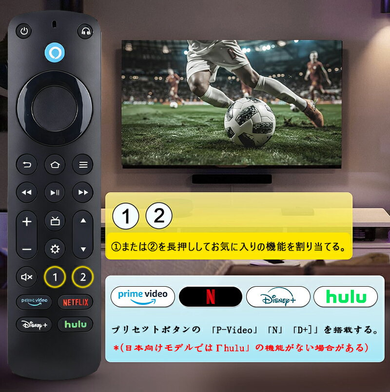 商 品 説 明 【商品名】 第4世代リモコンPro 【仕様】 サイズ:14.8*3.85*1.7cm 材質:ABS樹脂 付属品:本体*1 ご購入前にご注意ください: 当商品はテレビ用のリモコン交換品であり、ファイヤースティックは付属しておりません。ご購入の際は用途に合わせてお選びいただけますようお願い申し上げます。 注意点 : モニターの発色具合により、実際の商品と色が異なる場合がございます。 特 徴 【「アレクサ、リモコンを探して」 ― もう、リモコン探しにイライラしない。】 ソファの隙間やテーブルの上で行方不明になったリモコンも、大丈夫。Alexa搭載デバイス、スマートフォンのAlexaアプリ、またはFire TVアプリに向かって「アレクサ、リモコンを探して」と一声かけるだけで、リモコンが音で居場所をお知らせします。忙しい時や映画の途中でも、素早く見つけ出せます。 【ヘッドホンボタン ― プライベートな音響世界へワンタッチ】 ワイヤレスヘッドホンやBluetoothスピーカーを、煩わしい設定なしで簡単にFire TVに接続。専用のヘッドホンボタンを押すだけで、夜中の映画鑑賞や、ゲームに没頭するときも、周りを気にせず音響を楽しめます。 【2つのカスタムボタン ― あなたの「お気に入り」をすぐに起動】 NetflixやD+などよく使うアプリや、よく利用するAlexaの便利コマンド(「天気を教えて」など)を2つのカスタムボタンに割り当て可能。面倒な操作は一切不要。ボタンを押すだけで、すぐにお目当てのアプリや機能にアクセスできます。あなただけの最速ショートカットで、エンターテインメントをもっと手軽に。 【テレビ操作もこれ1台 ― シンプルで整理整頓】 このリモコン1台で、Fire TVだけでなく、接続したテレビ本体の電源のON/OFF、音量の調節も可能です(※放送チャネルの変更には対応しておりません)。リモコンが増える煩わしさから解放され、すっきりとしたエンターテインメント環境を実現します。 【 リモコンでAlexa ― 声で全てがもっと簡単に】 リモコンのマイクボタンを押しながら話しかけるだけで、Alexaがあなたの声を認識。面倒な文字入力は必要ありません。 メーカー保証付き ご購入商品に不具合があった場合は、いつでもメールでご連絡ください。 是非丁寧に対応致させていただきます。 また、ご使用途中に、何かご不明な点や問題がございましたら、気軽にお問い合わせください。 リモコンのペアリング方法 元のリモコンが使用できる場合、設定には2つのリモコンが必要です。 1.新しいリモコンに電池を入れ、ホームボタンを一度押してください。 2.まず、元のリモコンでホームボタンを押してください。次に、メニューから[コントローラーとBluetoothデバイス]タブを選択し、「Amazon Fire TV リモコン」→「新しいリモコンを追加」の順に選択します。 その後、新しいリモコンがリストに表示されているか確認してください。 モコンを使用できない 1.元のリモコンの電池を2つとも抜いた後、新しいリモコンに新しい電池を入れる。 2.Fire TVデバイスの電源コードを抜き差しして再起動します。Fire TVのホーム画面が表示された後、画面に「リモコンを検出できません」と表示されるまで60秒ほどお待ちください。 3.新しいリモコンのホームボタンを1回押してください。リモコンがFire TVデバイスと正常にペアリングされ、リモコンの青いライトが点滅する。 ※ペアリングが完了しない場合は、リモコンのホームボタンを琥珀色に点滅し始めるまで長押ししてください(10秒以上かかる場合があります 関連キーワード 電池付きリモコン 交換用リモコン テレビリモコン Alexa 4K ウルトラHD HDR- Fire TV Stick Alexa第4世代 -音声コントロール 代用リモコン ファイヤースティック メーカー希望小売価格はメーカーカタログに基づいて掲載しています