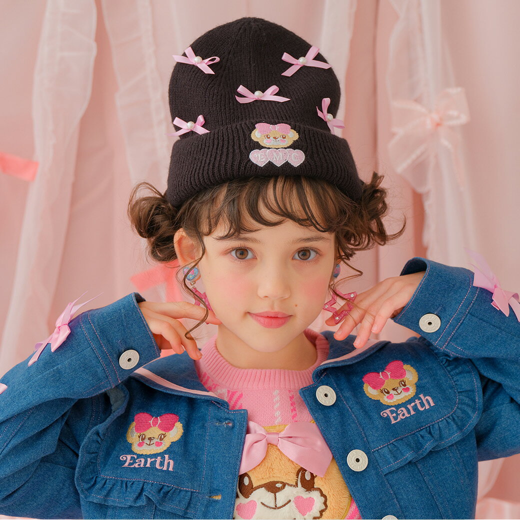 【EARTHMAGIC正規取扱店】アースマジック 2024秋 リボン付ニットキャップ クロ マフィー アクセサリー 女児 女の子 子供服 キッズ 帽子 ハット ニット帽