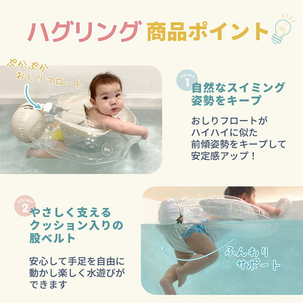 商品詳細 商品名 スイマーバ ハグリング 商品説明 スイマーバ0歳からのプレスイミングシリーズの最新作! タミリングに、体をサポートできる「おなかベルト」を搭載。 これにより、あおむけ、うつぶせの2パターンの姿勢で水に浮かぶ感覚を楽しむことができます。 カラー バニラ 対象 首すわり後〜2歳頃までかつ体重15kgまで (うきわから抜け落ちない、きつくないお子様) セット内容 本体、日本語公式ガイド サイズ うきわ内径(横幅) 約17cm うきわ内周 約60cm 素材 塩化ビニル樹脂(PVCプラスチック) メーカー 有限会社FUNAZAWA 注意事項 当社では複数店舗で在庫を共有しており、システムで在庫調整を行っておりますが、TV放映等による一時的な注文数の増大や、在庫の更新タイミングにより在庫にずれが生じる場合がございます。 在庫更新が間に合わずご注文頂いた商品が欠品となる場合もございます。 欠品が生じた場合や商品の発送が遅れる場合は、改めてご連絡させていただきます。 ご迷惑をお掛けする場合がございますが、あらかじめご了承くださいませ。 広告文責 有限会社ビレイズ 06-6536-9555 関連キーワード Swimava スイマーバ うきわ 浮き輪 首リング ベビーエクササイズ うきわ プレスイミング プール バス あおむけ うつぶせ お風呂 知育 ギフト 誕生日 出産祝い ベビー 赤ちゃん タミリング商品詳細 商品名 スイマーバ ハグリング 商品説明 スイマーバ0歳からのプレスイミングシリーズの最新作! タミリングに、体をサポートできる「おなかベルト」を搭載。 これにより、あおむけ、うつぶせの2パターンの姿勢で水に浮かぶ感覚を楽しむことができます。 カラー バニラ 対象 首すわり後〜2歳頃までかつ体重15kgまで (うきわから抜け落ちない、きつくないお子様) セット内容 本体、日本語公式ガイド サイズ うきわ内径(横幅) 約17cm うきわ内周 約60cm 素材 塩化ビニル樹脂(PVCプラスチック) メーカー 有限会社FUNAZAWA 注意事項 当社では複数店舗で在庫を共有しており、システムで在庫調整を行っておりますが、TV放映等による一時的な注文数の増大や、在庫の更新タイミングにより在庫にずれが生じる場合がございます。 在庫更新が間に合わずご注文頂いた商品が欠品となる場合もございます。 欠品が生じた場合や商品の発送が遅れる場合は、改めてご連絡させていただきます。 ご迷惑をお掛けする場合がございますが、あらかじめご了承くださいませ。 広告文責 有限会社ビレイズ 06-6536-9555 関連キーワード Swimava スイマーバ うきわ 浮き輪 首リング ベビーエクササイズ うきわ プレスイミング プール バス あおむけ うつぶせ お風呂 知育 ギフト 誕生日 出産祝い ベビー 赤ちゃん タミリング